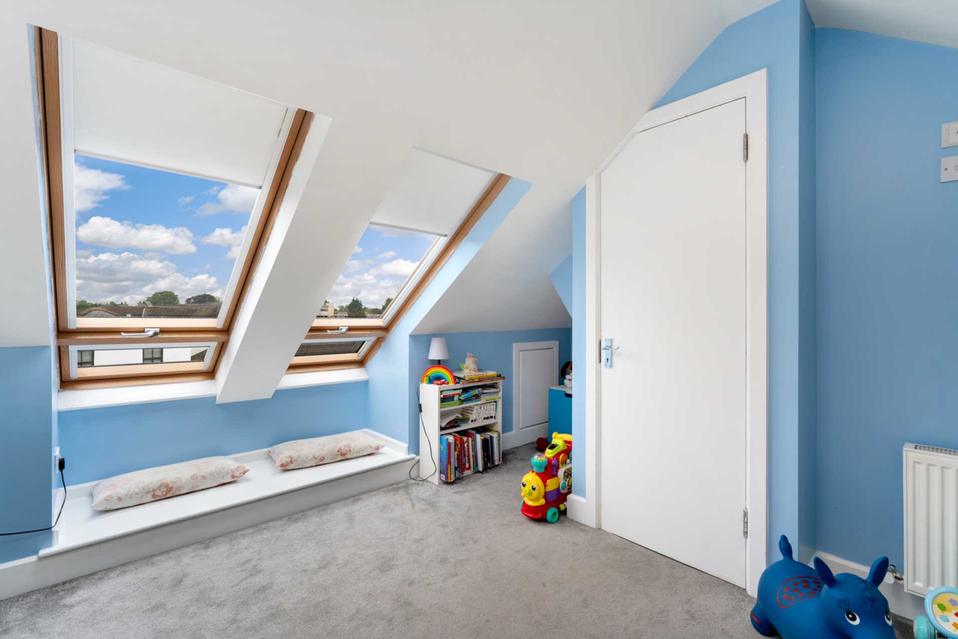 Two large skylights. Carpet. Child`s walk-in closet. Bookshelf. Door to ensuite. This room is categorized as non-habitable space suitable for a home office, playroom or store room.