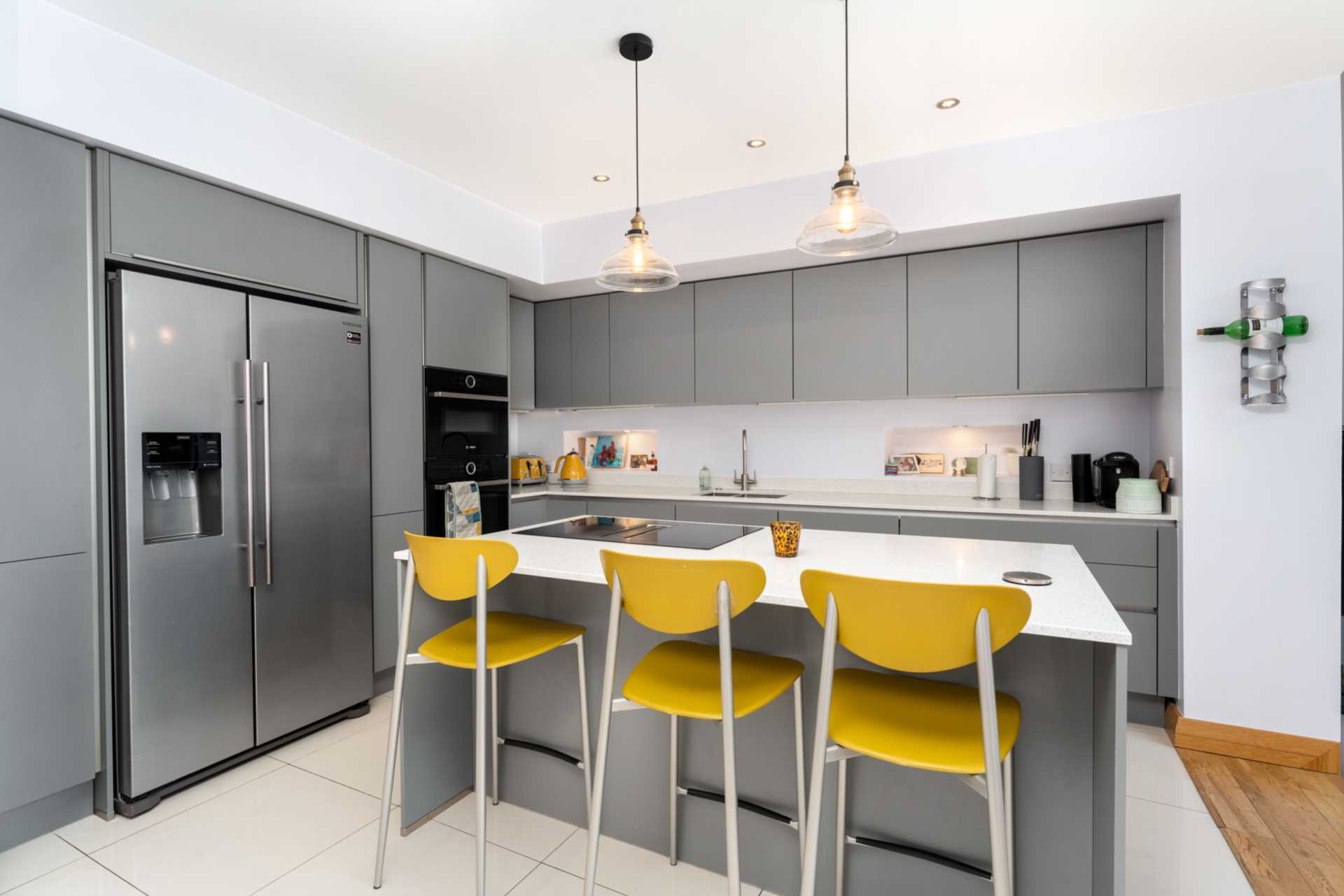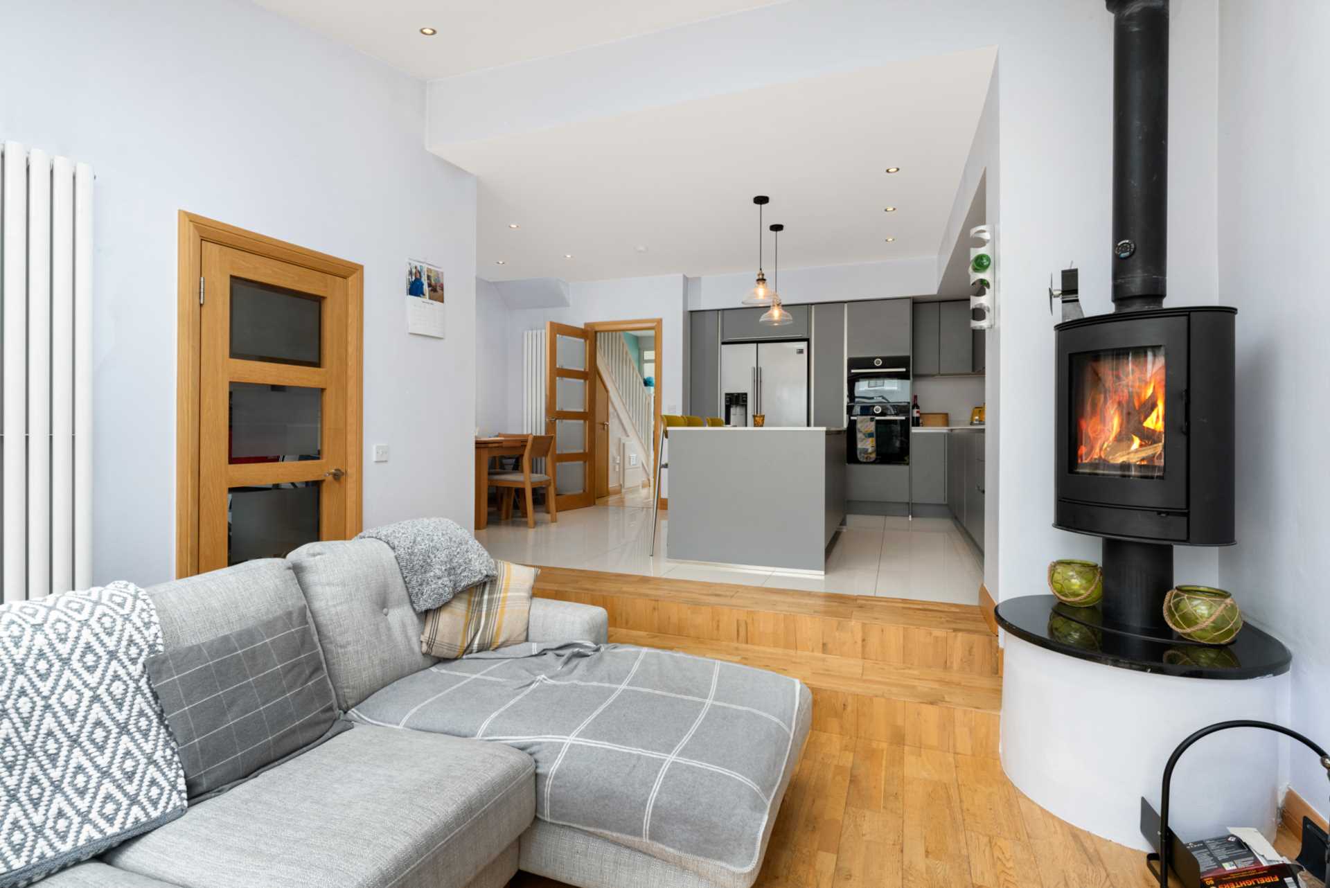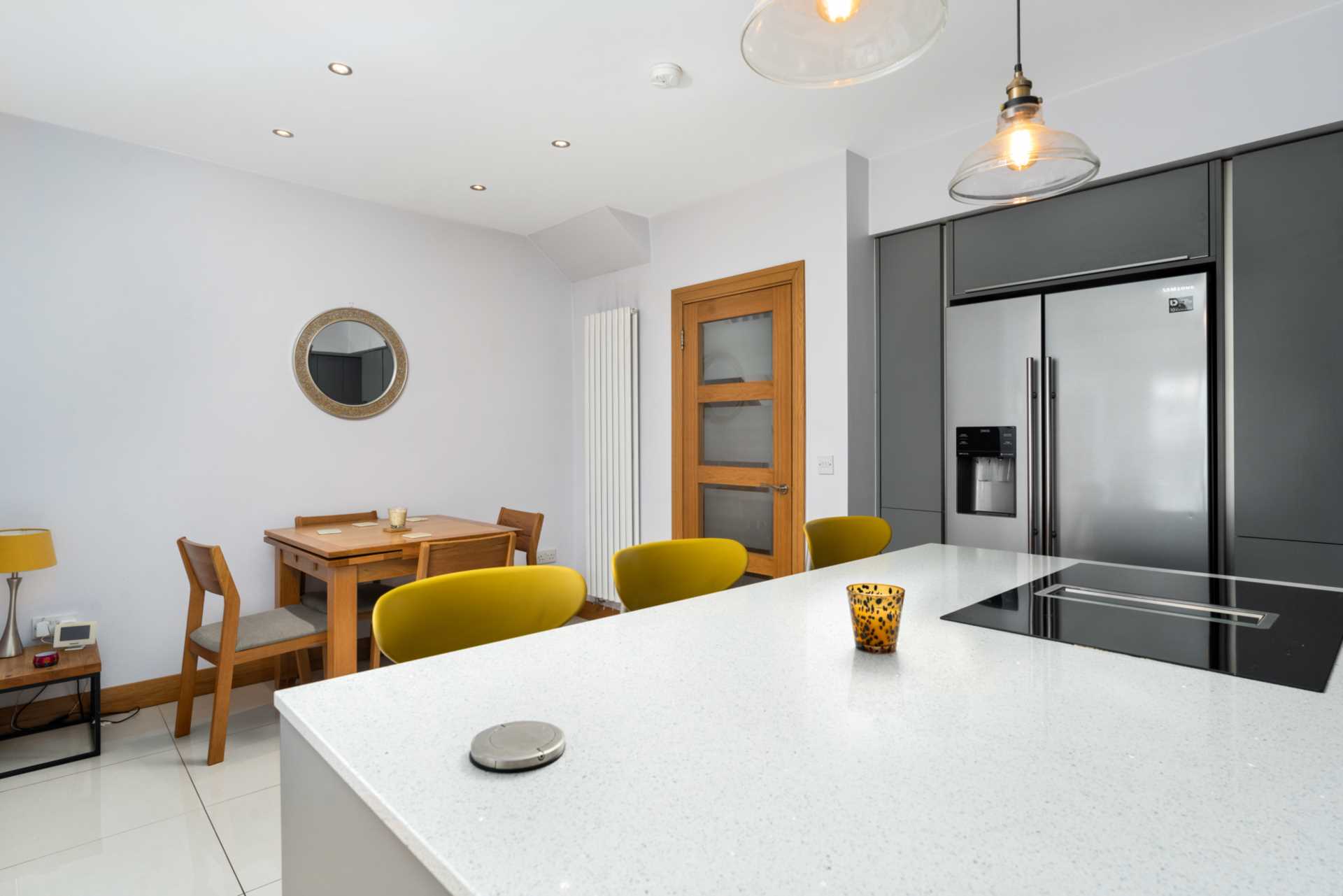 New open plan kitchen dining room stretching the full width of the house, Beautiful matt grey Kube fitted kitchen with recessed lit display boxes. The contrasting Silestone white quartz counter tops come with a 25 year warranty. The kitchen comes equipped with a Samsung American style fridge-freezer with filtered water and ice, a fitted dishwasher and a double oven containing an eye level pyrolytic self-cleaning oven and a combo grill/microwave. There is also an island with a breakfast bar and an induction hob. The down-draft extractor in the island leaves space overhead for custom lighting. The island also features a handy pop-up electrical socket. Franke sink with "insinkorator" food waste disposal in drain and Franke mixer taps. Completing this picture of perfection is a high quality white ceramic tiled floor and recessed lighting. This space is filled with natural light from a 3m wide opening to the rear extension containing a lovely bright family area with skylights and westerly facing glazing.