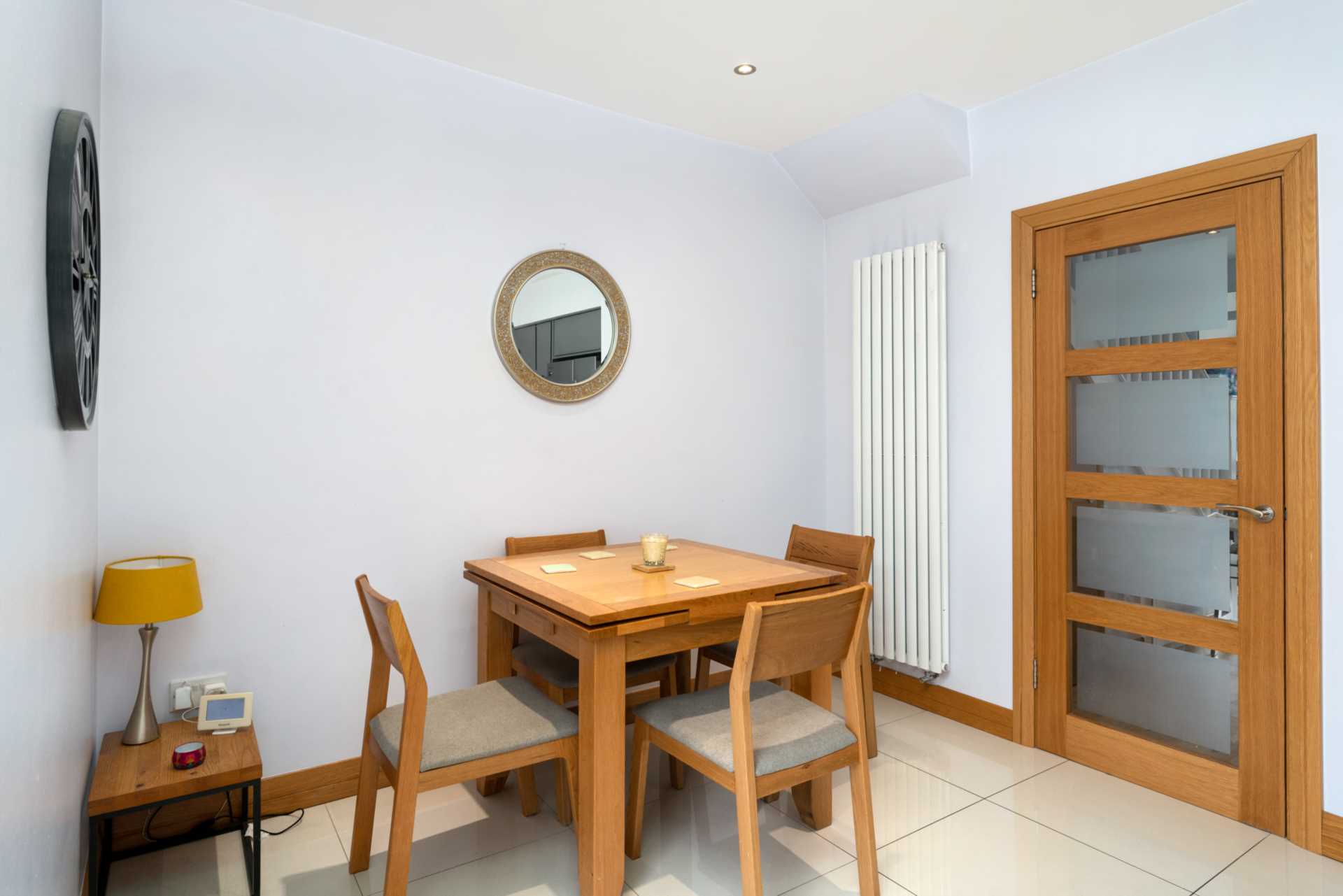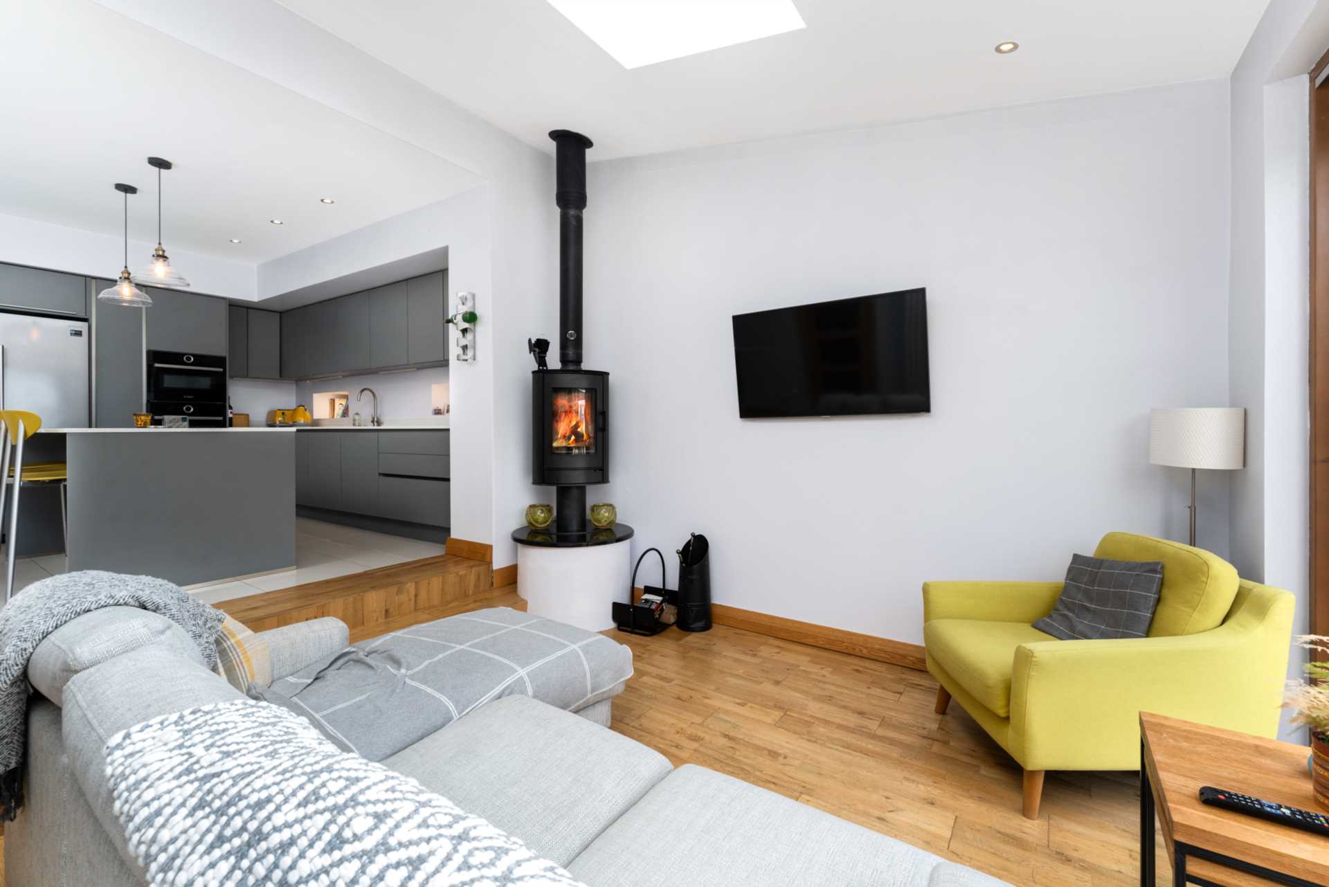 Oak flooring. Lofted ceiling with a maximum height of 3.3m and a large skylight. Floor to ceiling Vinders "lift and slide" retractable glass wall leading to the westerly facing sun deck. In one corner of this room there is a stylish wood burning stove on an oval black granite plinth. When this is lit it creates a lovely cosy glow, filling this whole area with comforting warmth. On one side of this room there is an oak door with frosted glass panels opening to the utility room. To complete this wonderful relaxing space there is a Virgin Media TV/ Broadband point with fibre optic connection on the street.