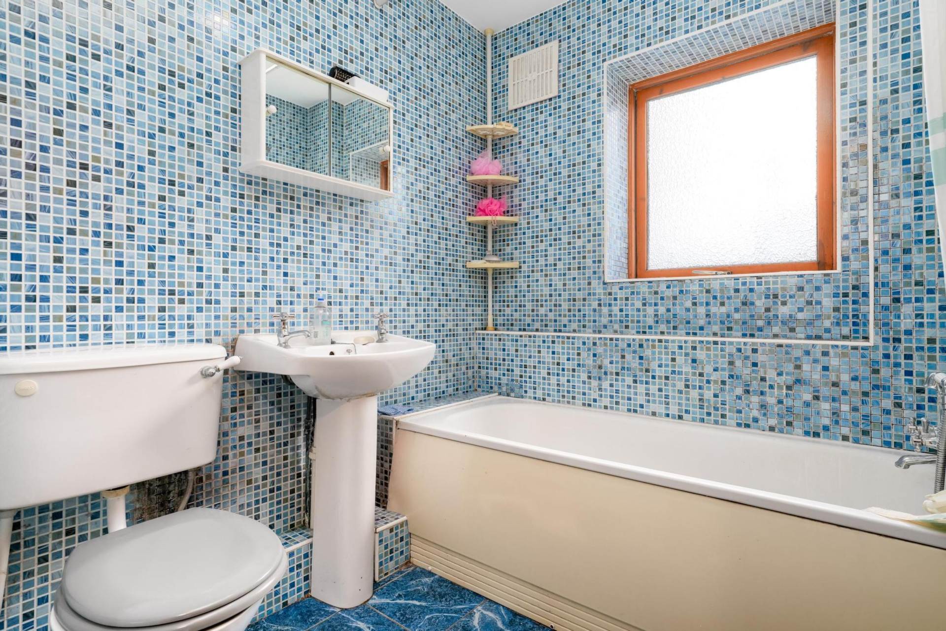 Bathroom: Fully tiled suite featuring a bath, WC, and WHB.