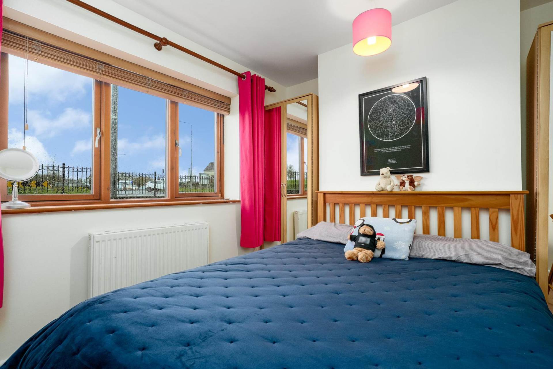 Bedroom One: Large double bedroom with wood-style laminate flooring and built-in wardrobe storage.