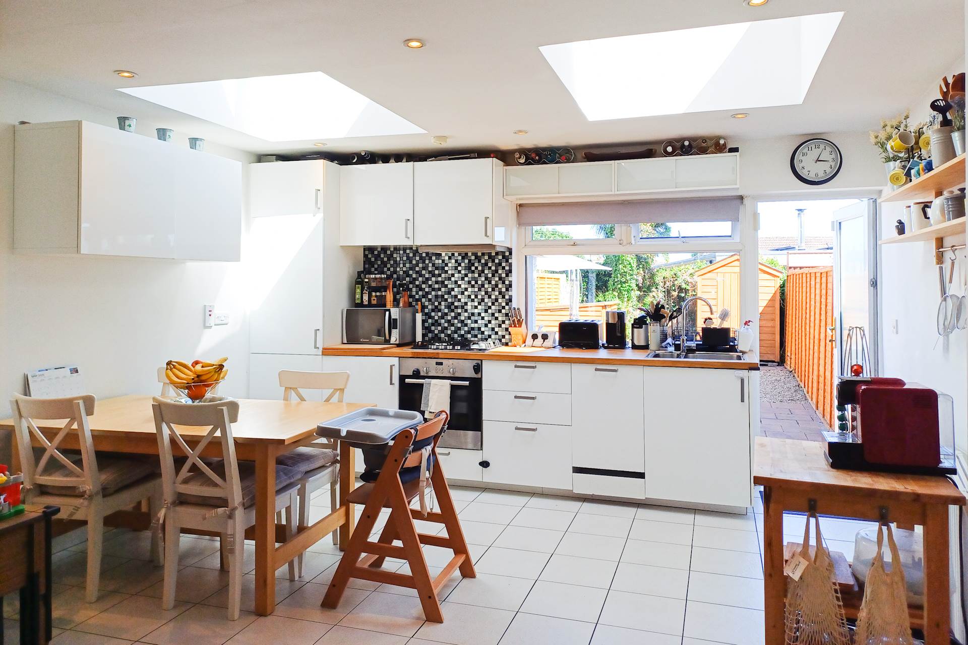 Modernization included a new extension, new high gloss white fitted kitchen, replumbing with a gas combi boiler heating system, rewiring, double-glazed windows, triple locking composite front door, floored attic storage and a low maintenance landscaped back garden.