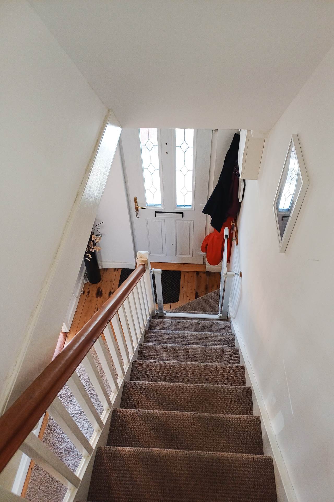 Finished pine floorboards. White painted stairs and banisters. Carpeted stairs and landing.