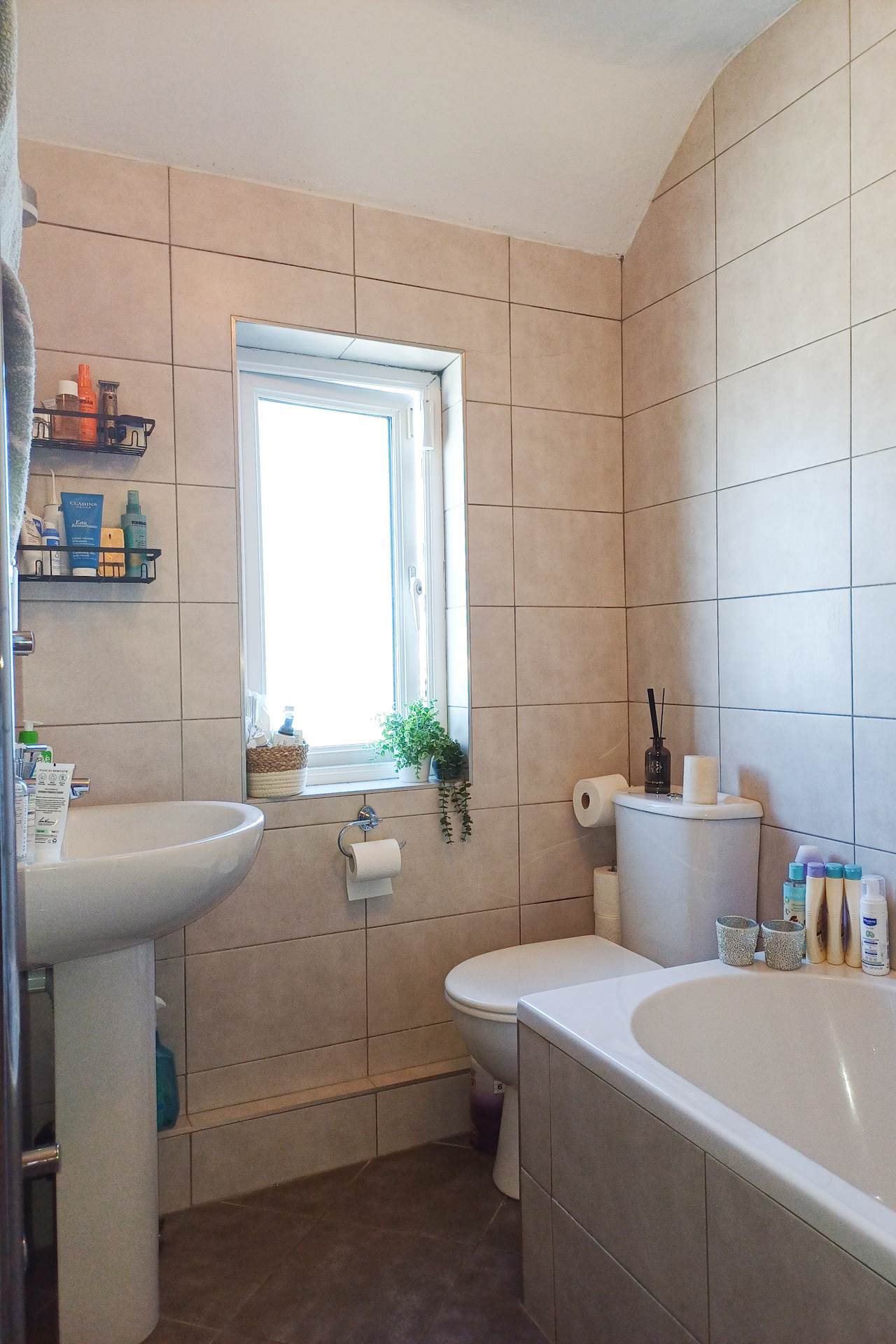 Fully tiled. Bathtub with wall mounted shower and glass shower screen. WHB. WC. Heated towel rail. Frosted glass window.