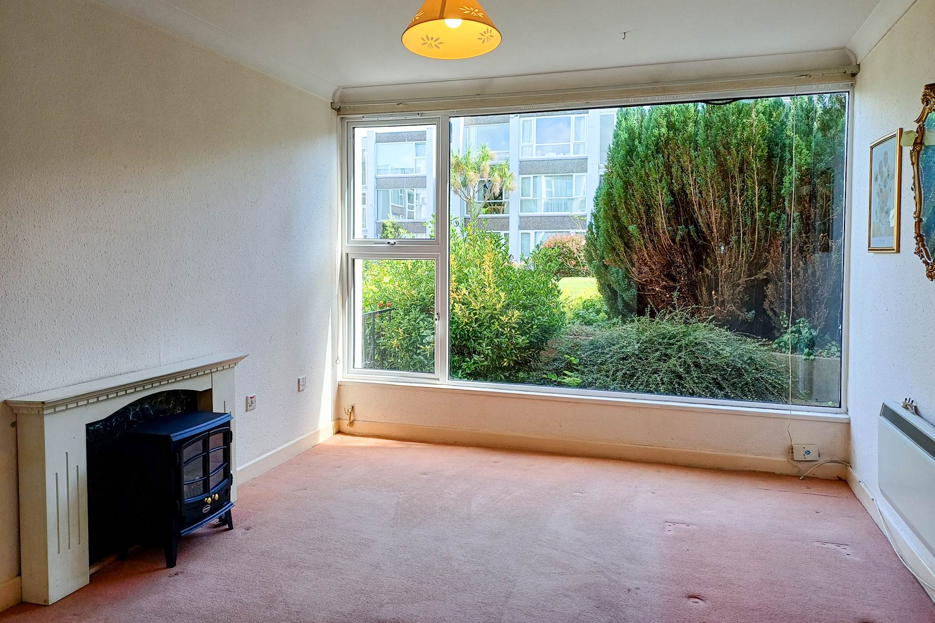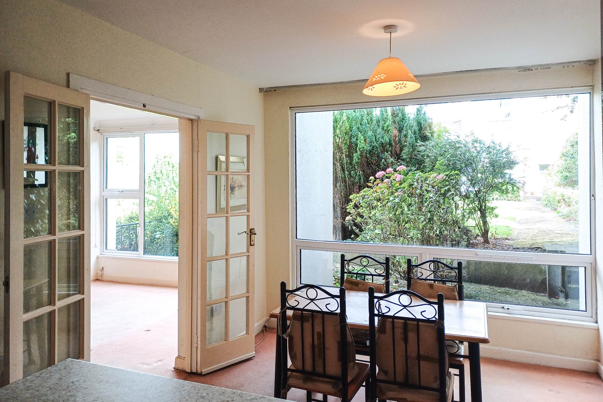 A large opening from the dining area connects to another spacious reception room with a second large wall-to-wall window facing the communal garden area. Carpet.