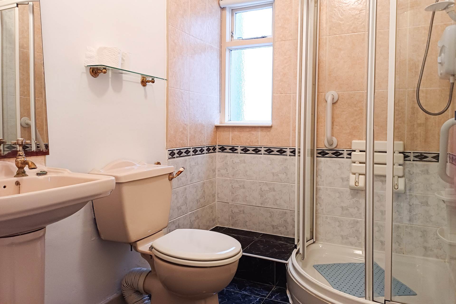 The bathroom has a WC, WHB and a Triton electric shower. It gets natural light and ventilation from the frosted glass window.