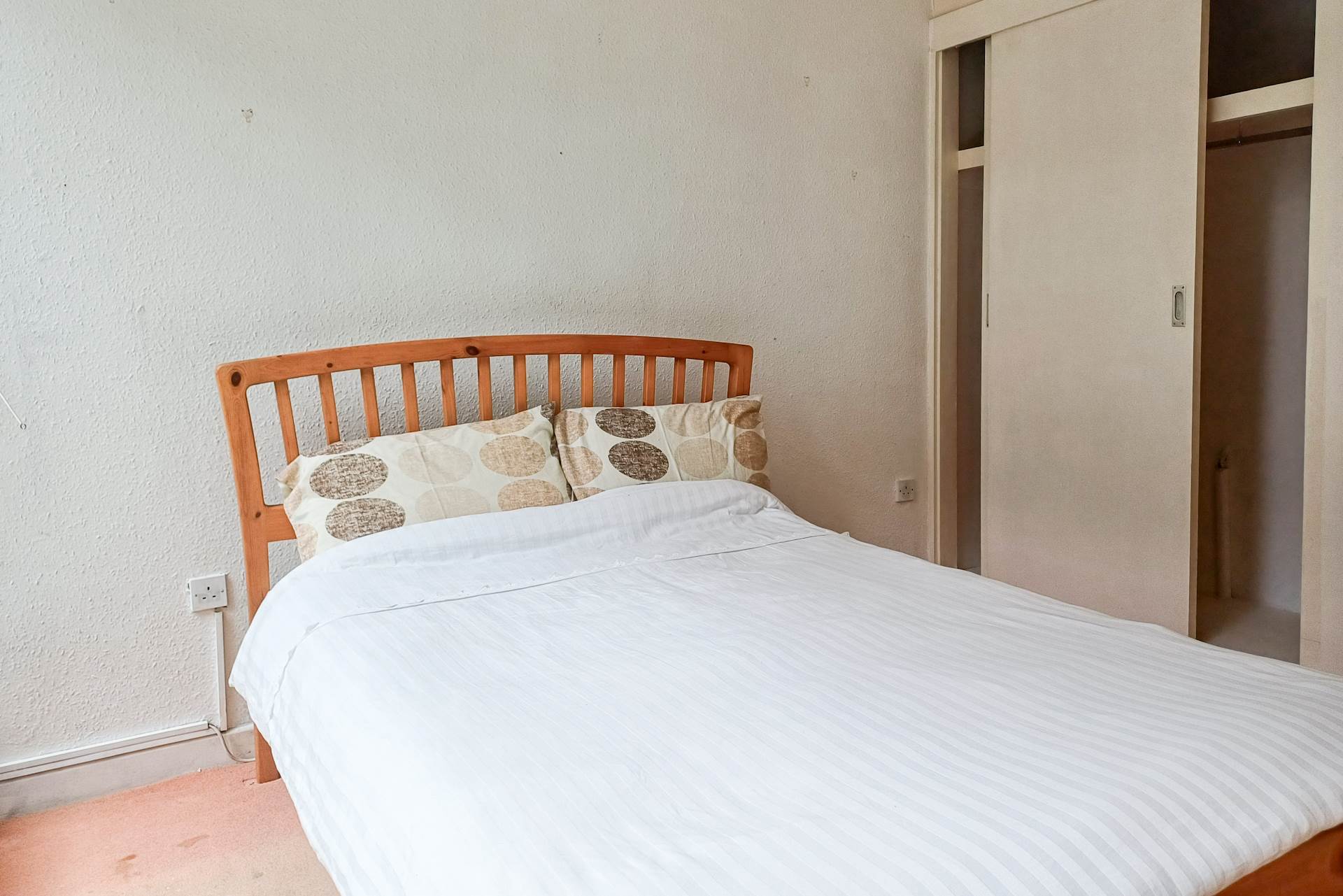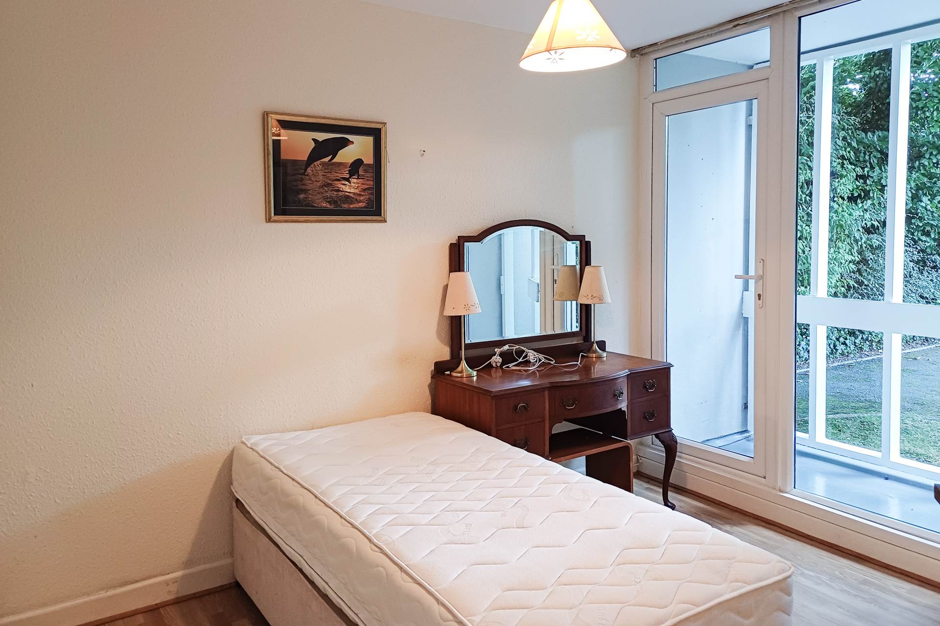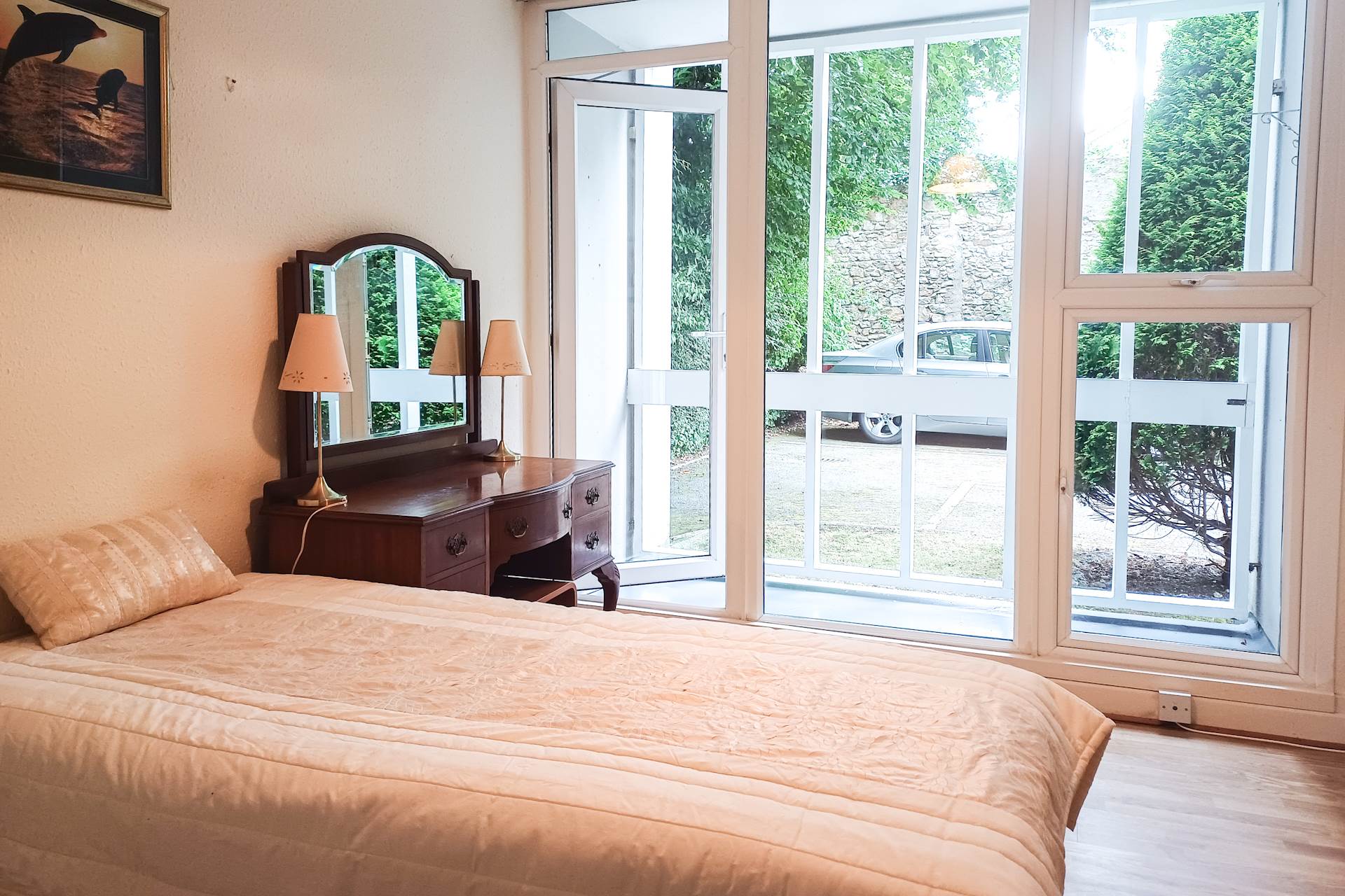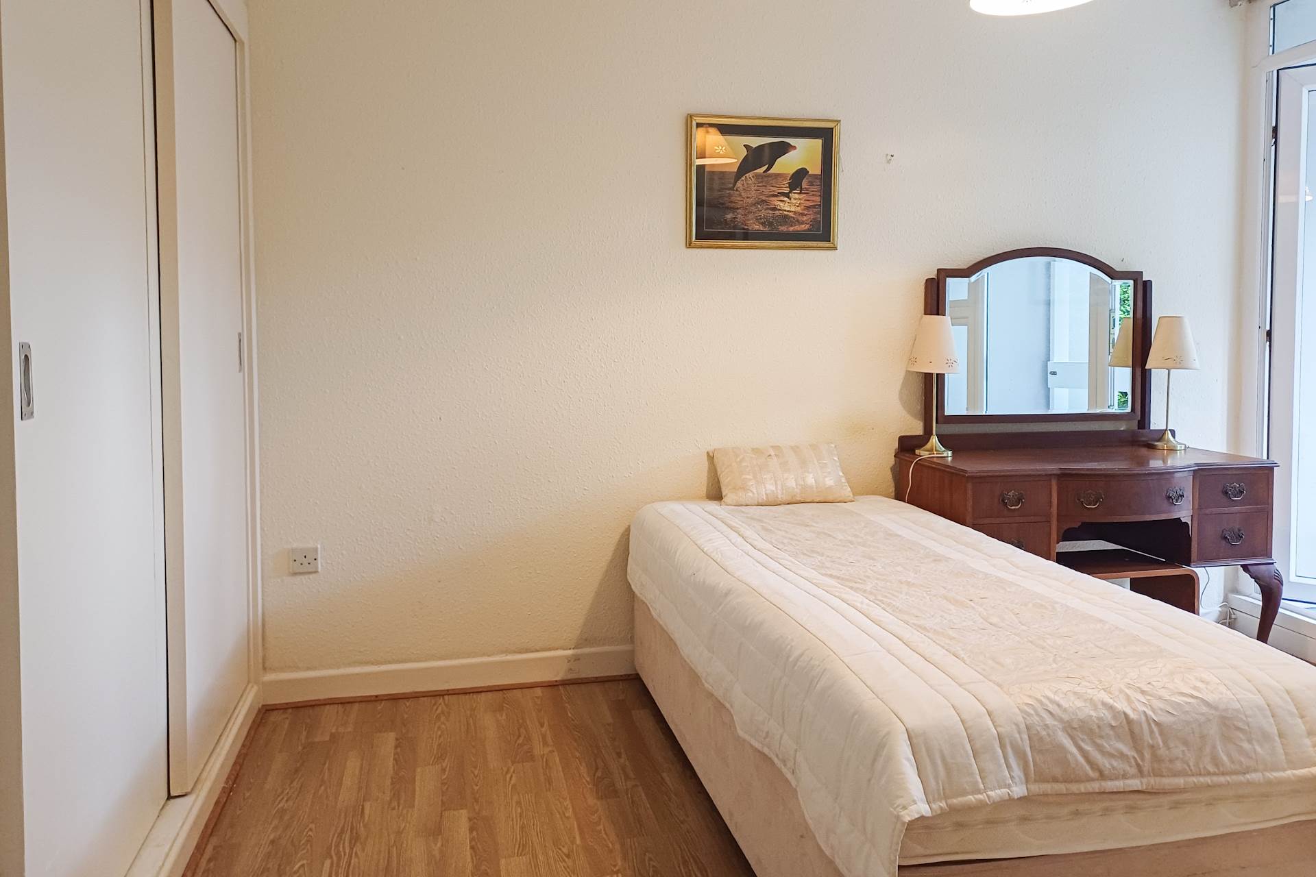 Spacious fitted wardrobes. Large window with glazed door opening to a private patio/balcony area. Carpet.