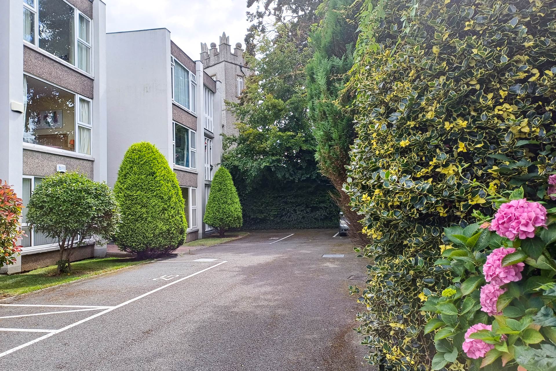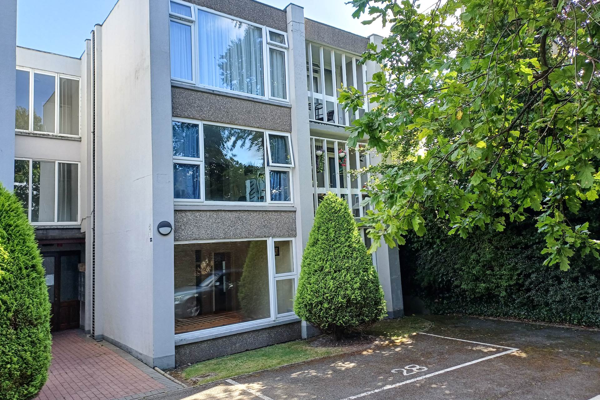 This bright and airy apartment boasts a nice open design with exceptionally large windows flooding it with natural light. The easterly facing windows look into the peaceful inner communal garden space. The westerly facing windows open to a quiet shrubbery area, the parking space for this apartment, and a high granite wall to the rear of Woodview Court. This is a well-settled community in a peaceful setting. It is less than 10 minutes walk from all the amenities in Stillorgan Village. Number 28 is a secure ground floor apartment with NO STEPS. It is tucked away in a secluded corner to the rear of the development.