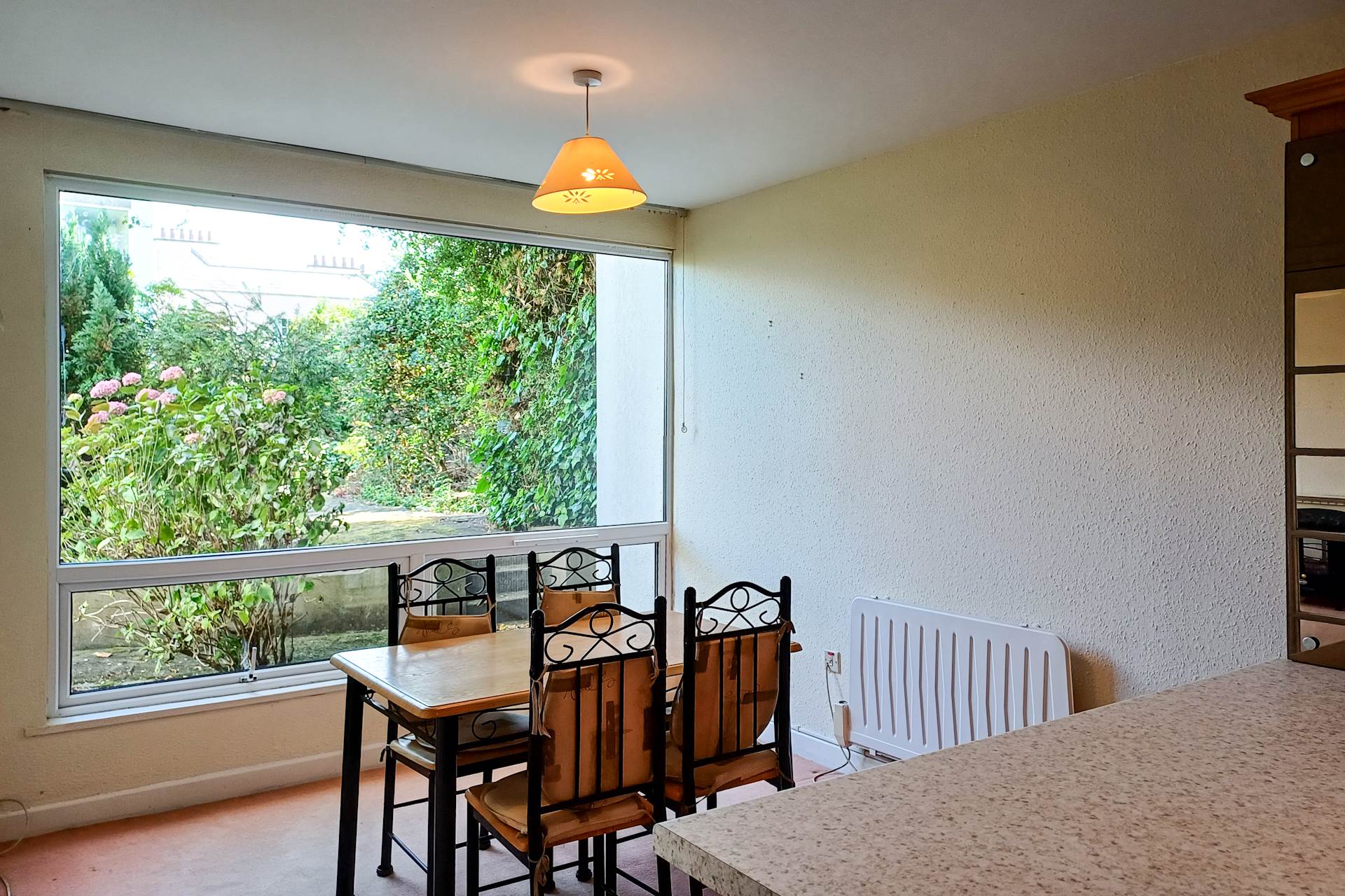 Spacious room with a large wall-to-wall window in the dining area. Fully-fitted kitchen with the full range of appliances included.