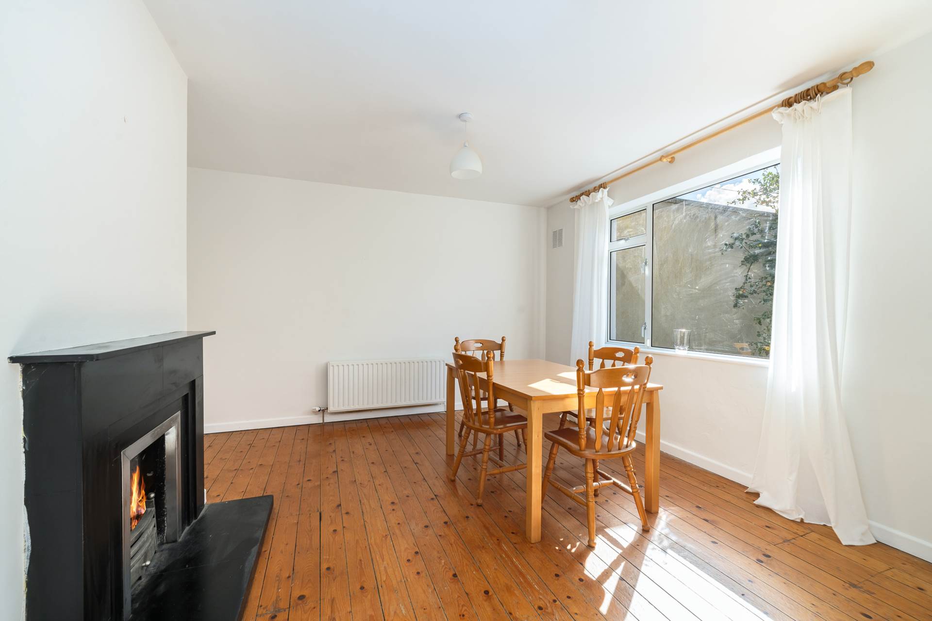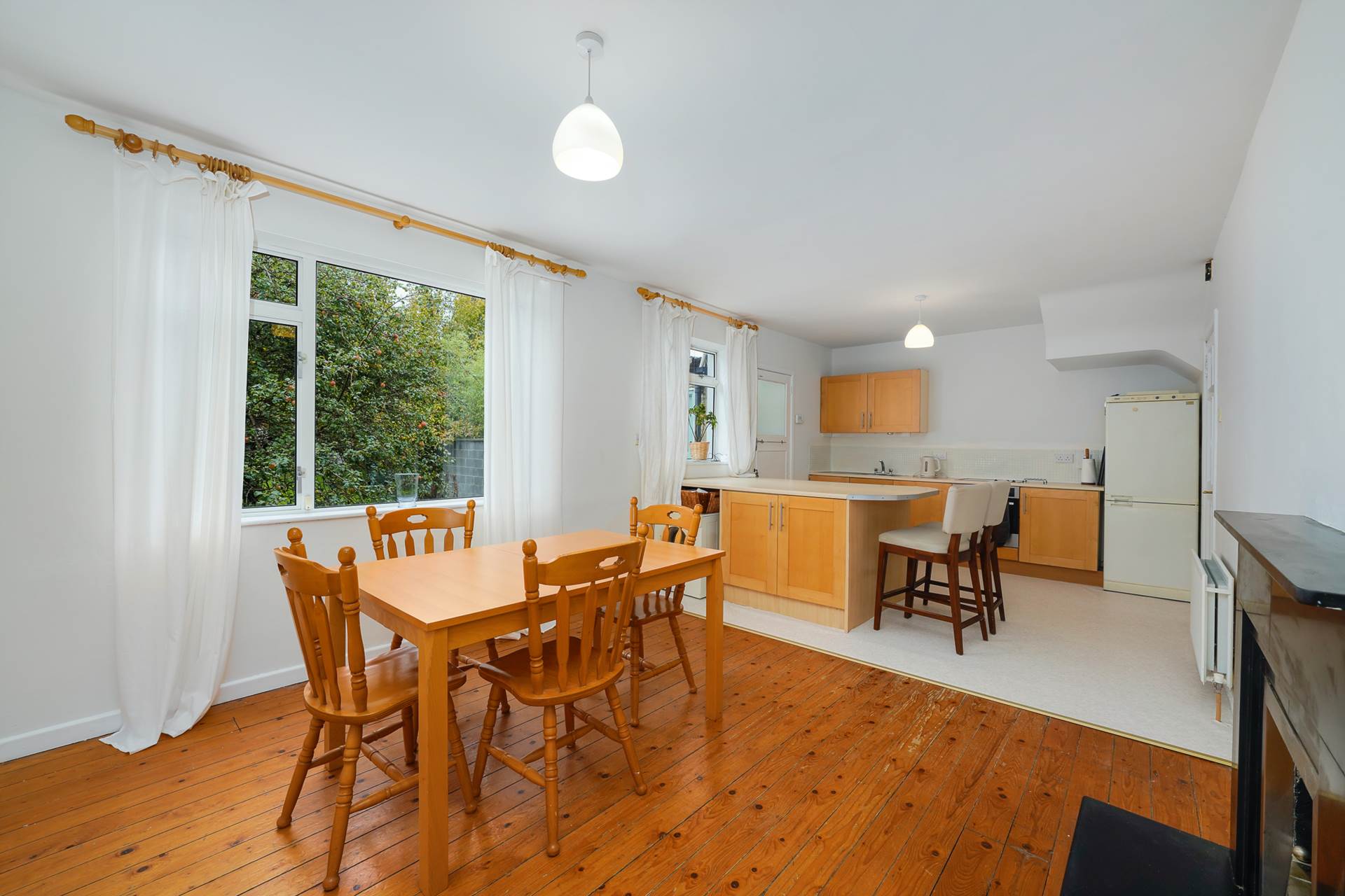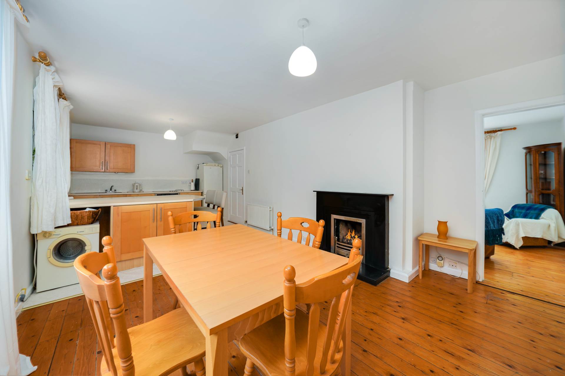 Fireplace. large window looking ut to the front of the house. Access to the kitchen/diner