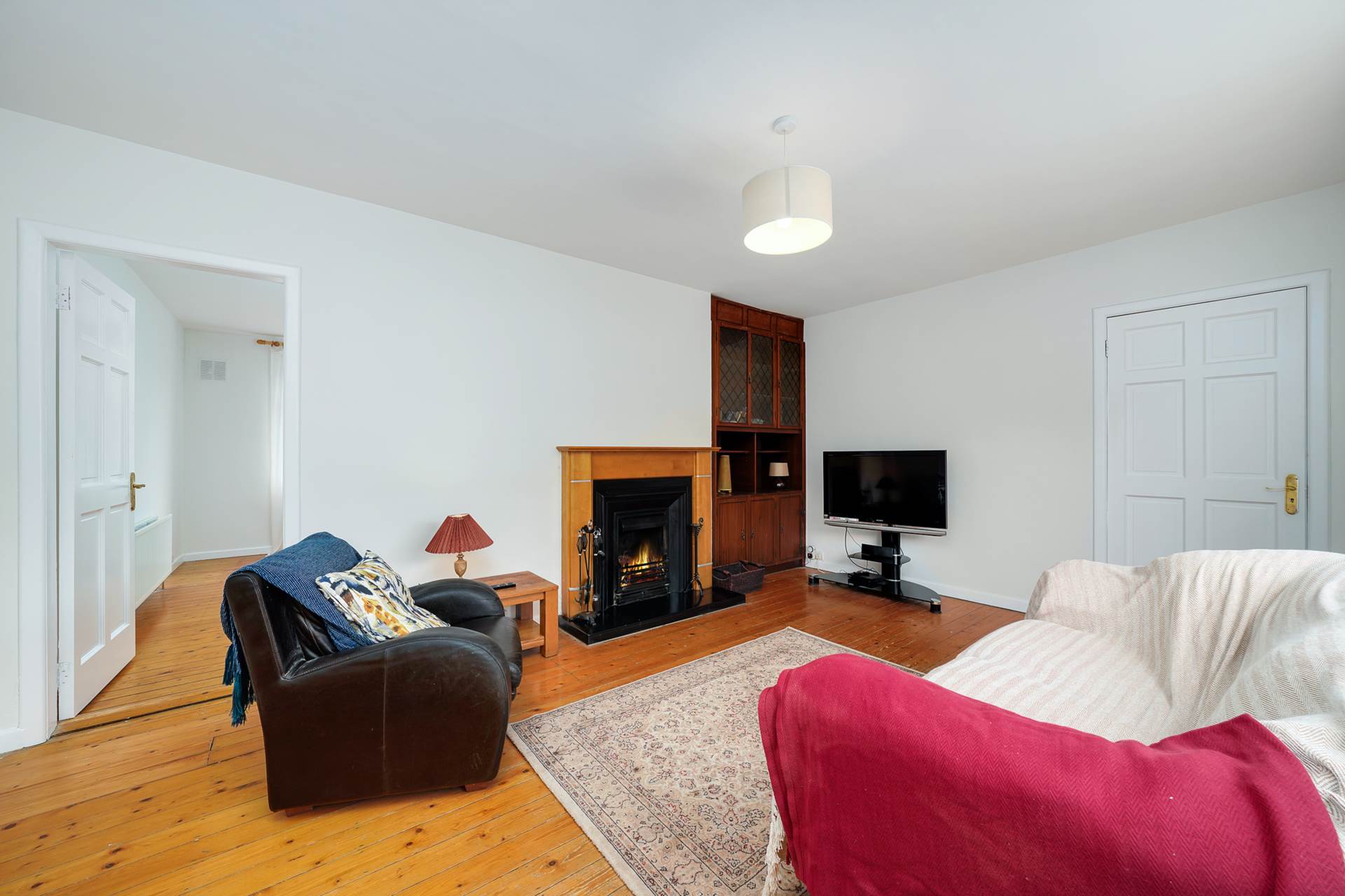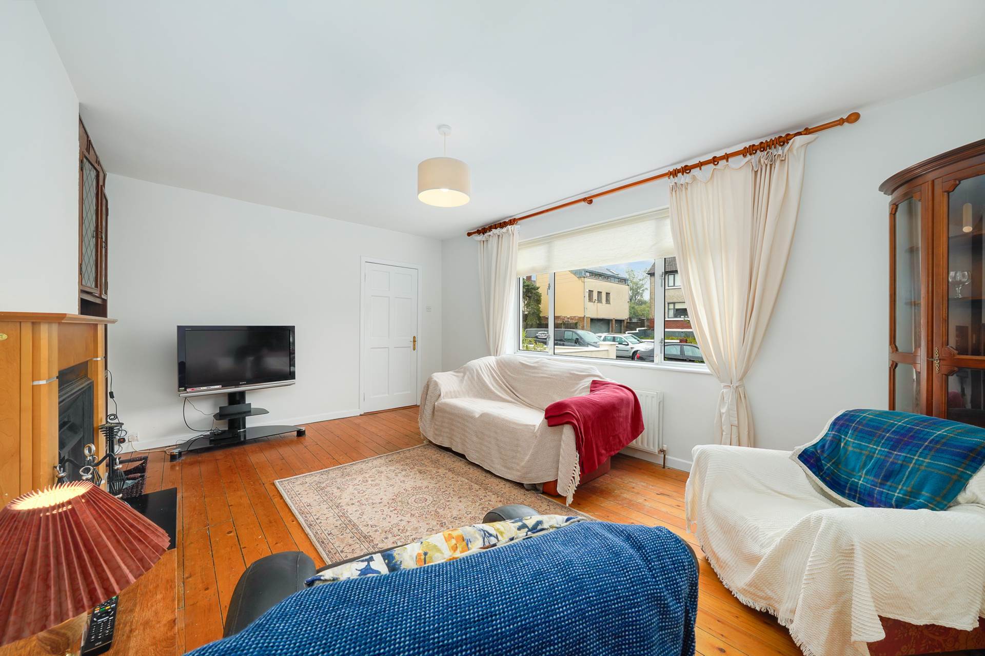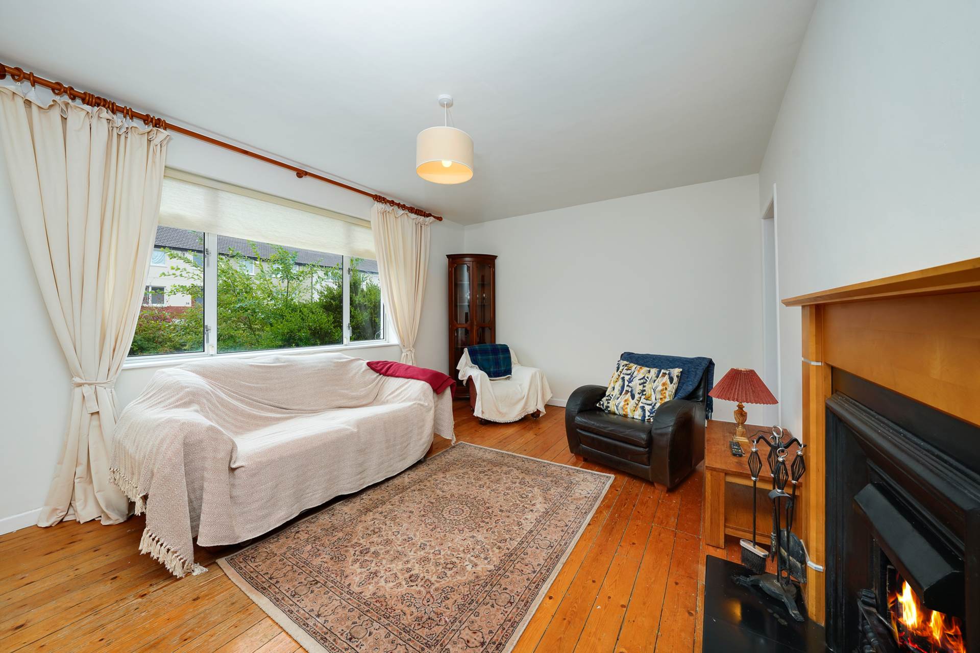 Fireplace. large window looking ut to the front of the house. Access to the kitchen/diner