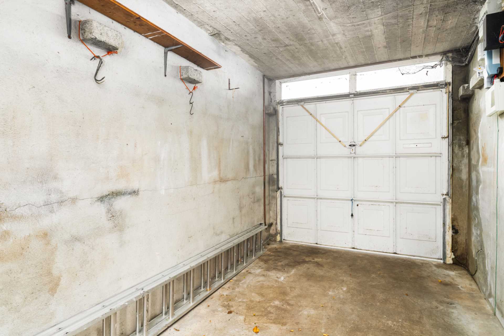 Up-and-over garage door. Door to kitchen. Concrete roof.