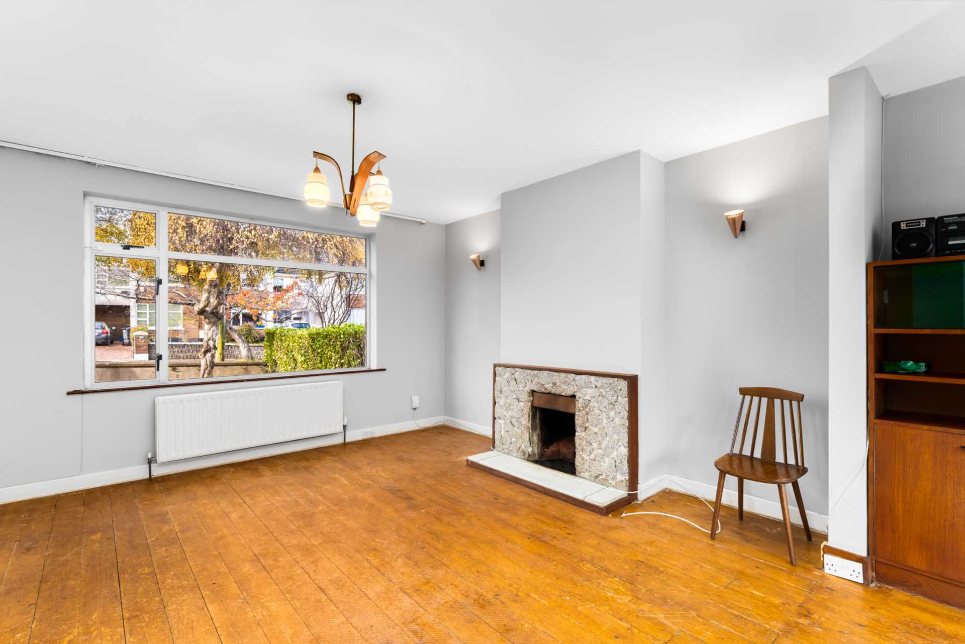 Lovely spacious room extending the full depth of the house. Large windows front and rear flooding this space with excellent natural light. Two fireplaces. Pine floorboards. Wall lights.