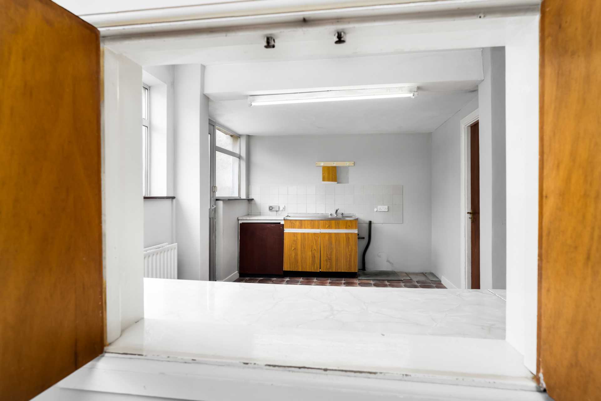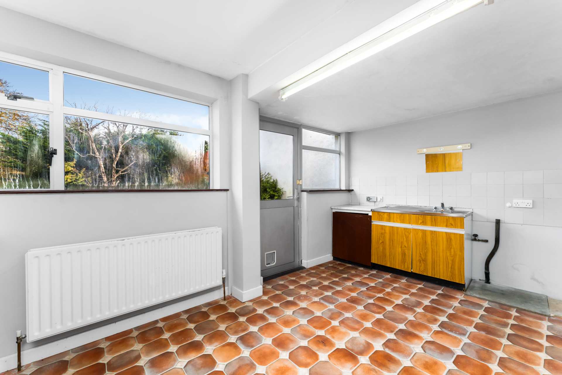 Another lovely bright space with two windows and a glazed door to the back garden. Service hatch to dining area. Pine floorboards. Sink.