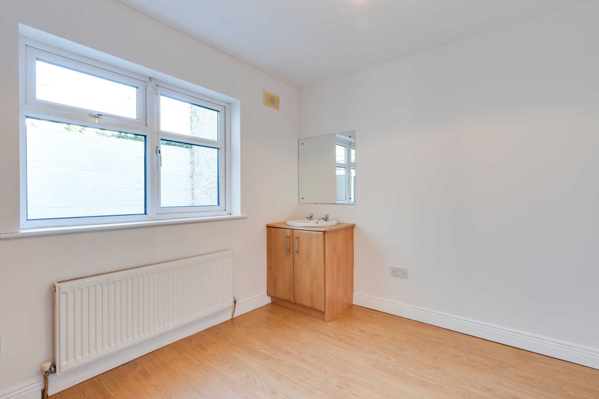 Wood laminate flooring. WHB with cabinet under. Fitted wardrobe. Window to inner courtyard.