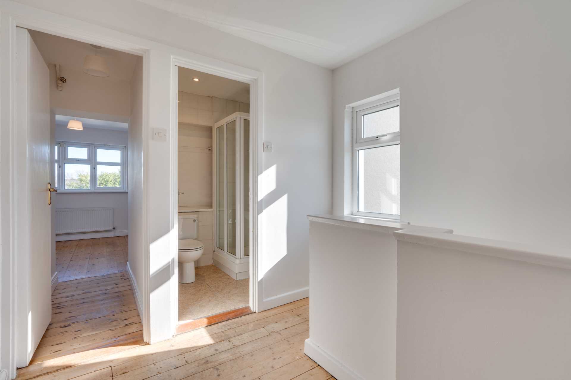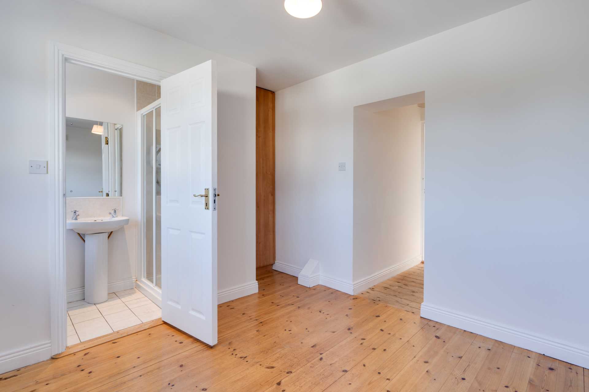 Spacious bedroom with large window to rear. Recessed wardrobe. Door to ensuite. Pine floorboards.