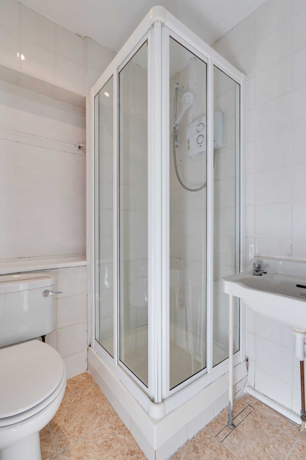 Floor tiling. Shower cubicle with electric shower. Pedestal WHB. Mirror. WC.