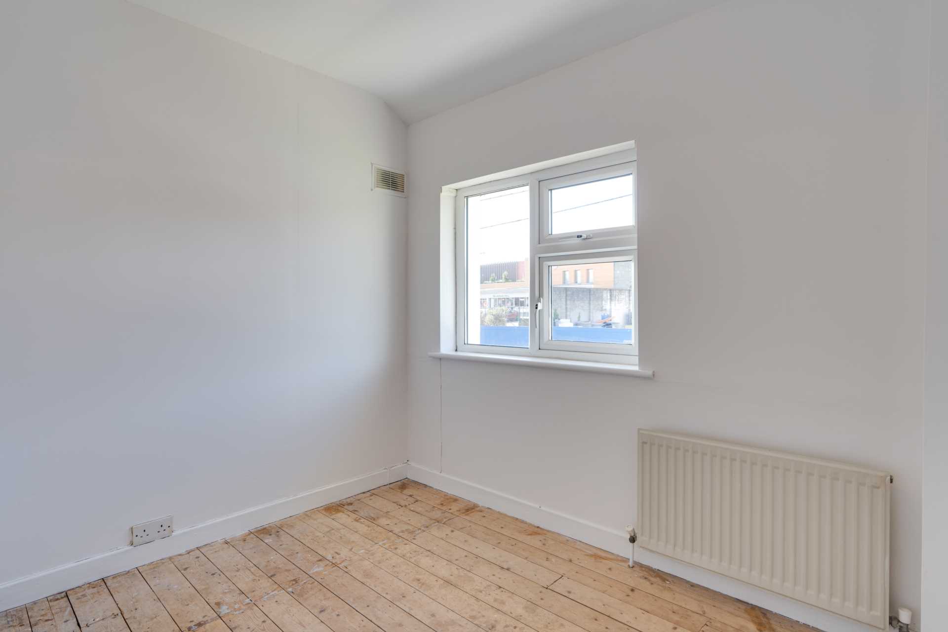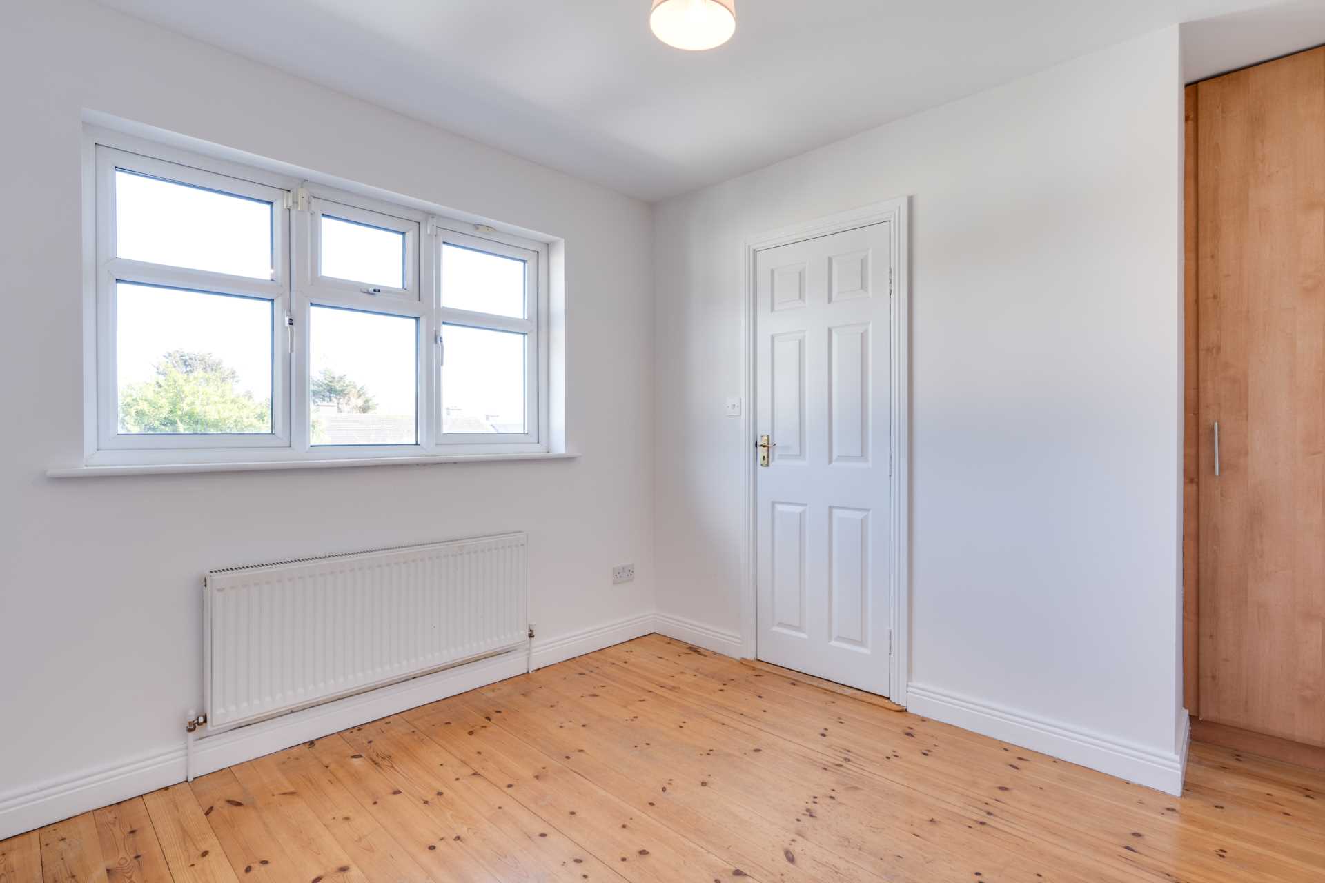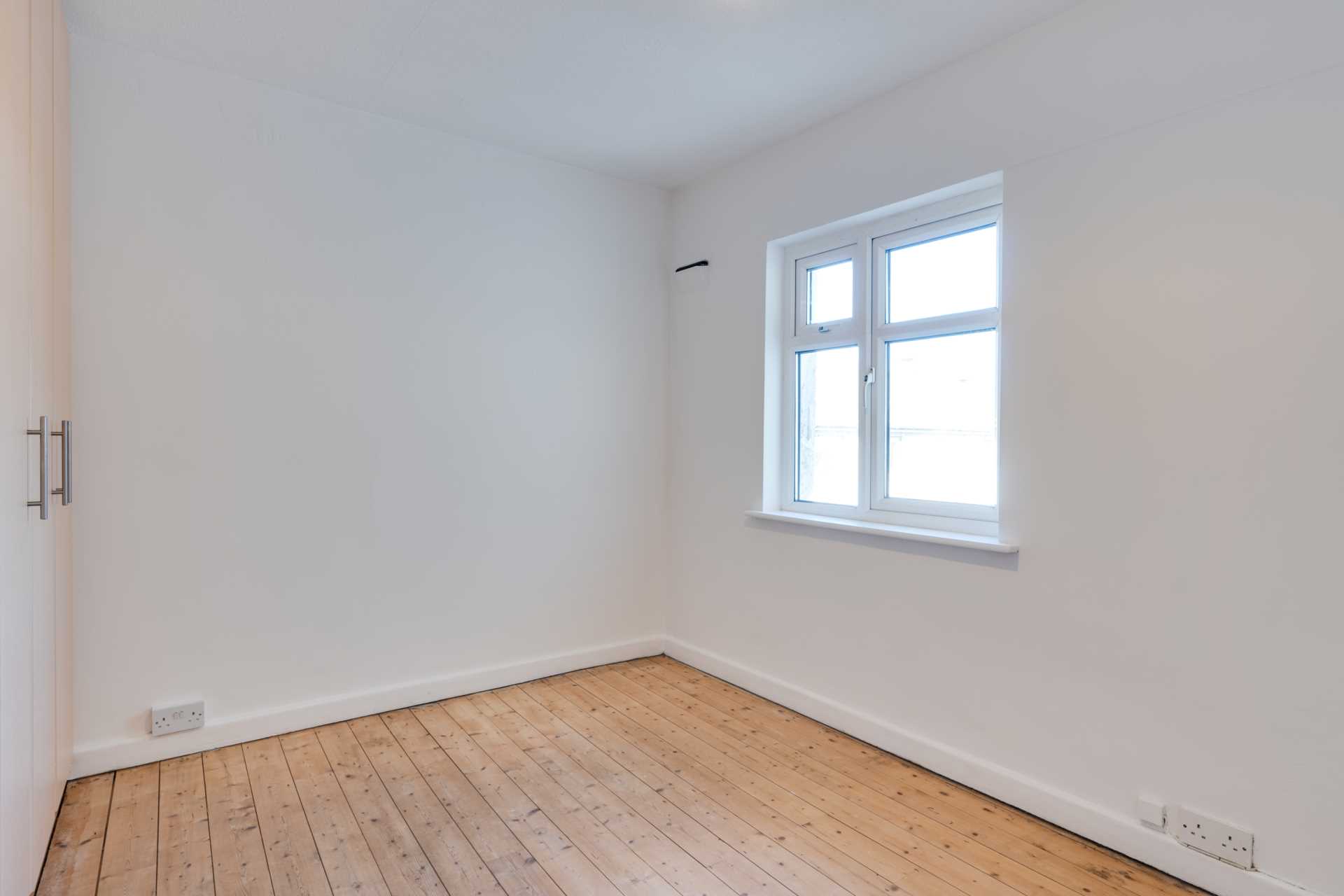 Fitted wardrobe. Blocked off chimney. Window. Original pine floorboards.