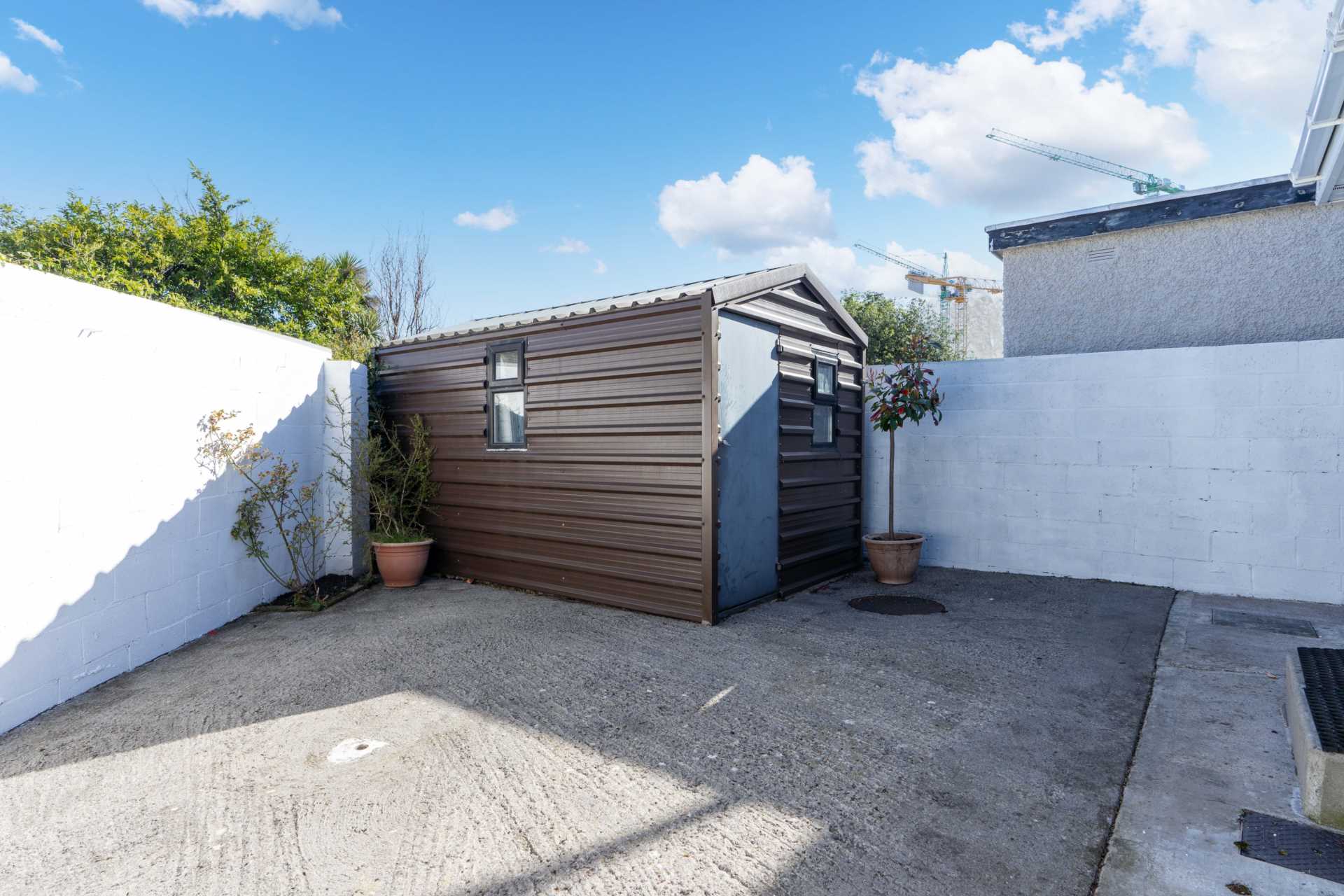 Triangular paved yard with large steel shed (3.6m x 2.4m). Side access.