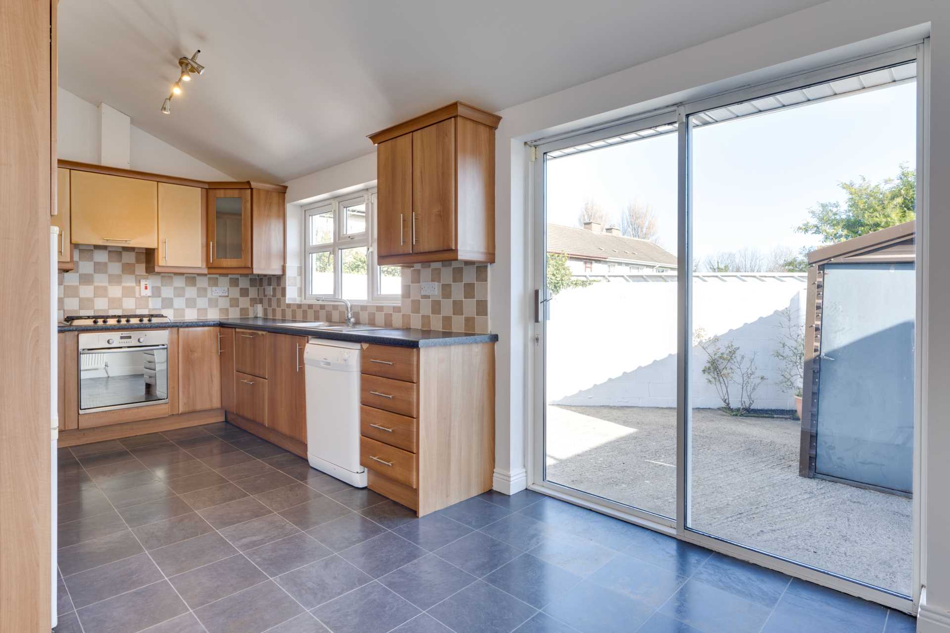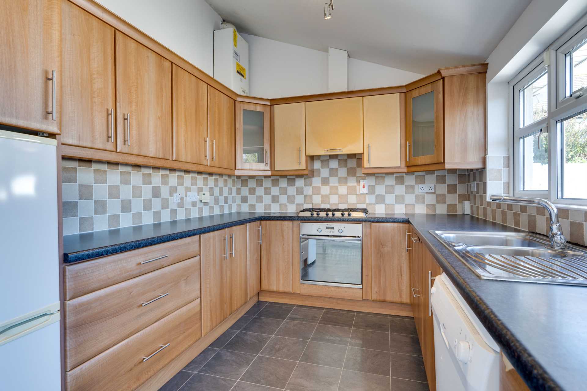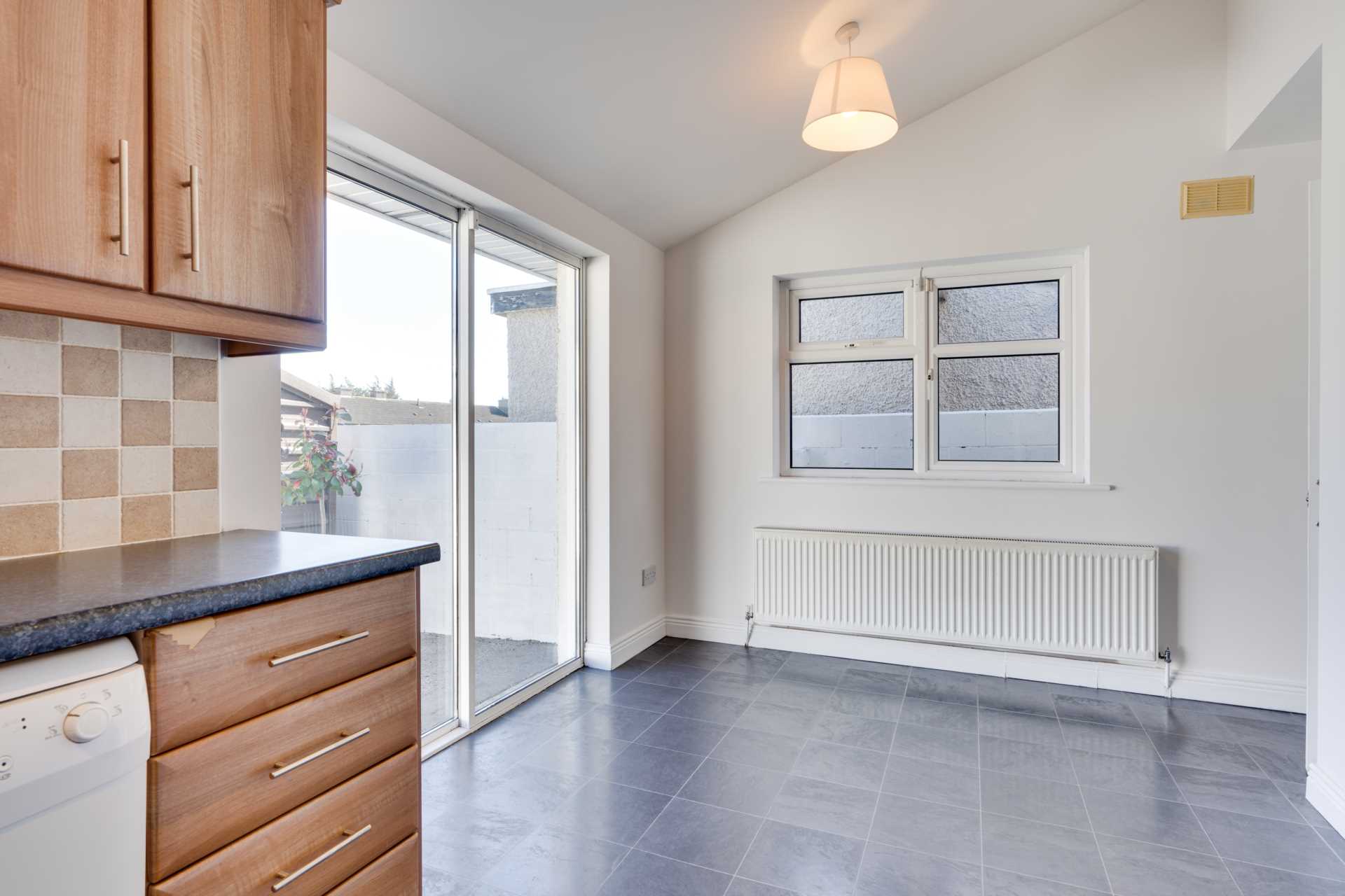Bright room with daul aspect windows and patio doors to the back garden. Fitted kitchen with appliances (fridge-freezer, dishwasher, 5 ring gas hob, Hotpoint oven, hood) included. Sink with drainer under kitchen window. Tile effect floor. Tiled splashback. Pitched roof (suitable for installation of skylights).