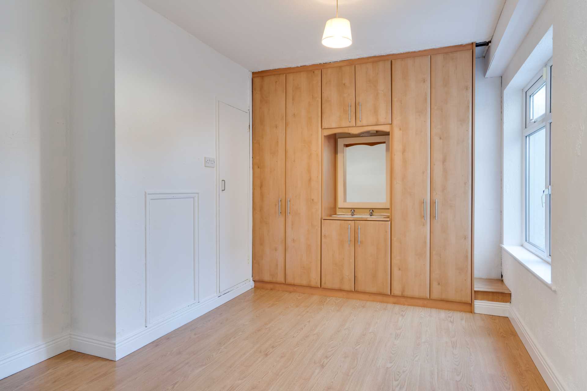 Currently used as a 6th bedroom. Blocked up serving hatch. Wardrobe with integrated WHB. Wood laminate flooring. Window.