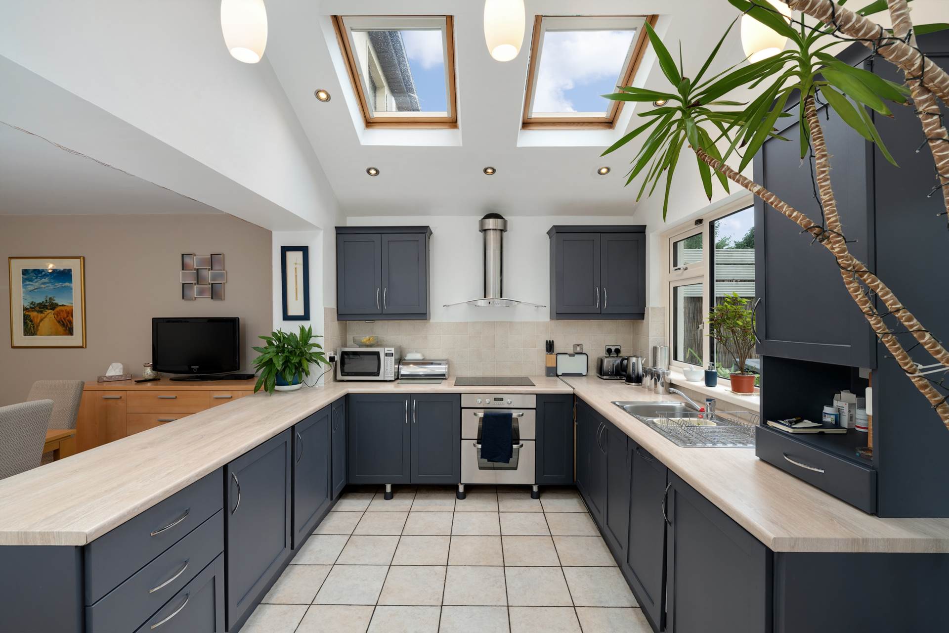 A peninsula counter divides the original dining room from the kitchen extension. The extension has a lofted ceiling with four skylights and also a large kitchen window and patio doors opening to the totally private back garden - flooding this space with abundant natural light. The fully fitted kitchen comes equipped with an electric oven and hob with a stainless steel hood, an integrated dishwasher, washing machine and under counter fridge and freezer, The kitchen sink, under the kitchen window has a rinse bowl and mixer taps. The dryer is outside in a garden hutch - to avoid excess heat and humidity in the house. Beside the patio doors is a breakfast bar with two stools.