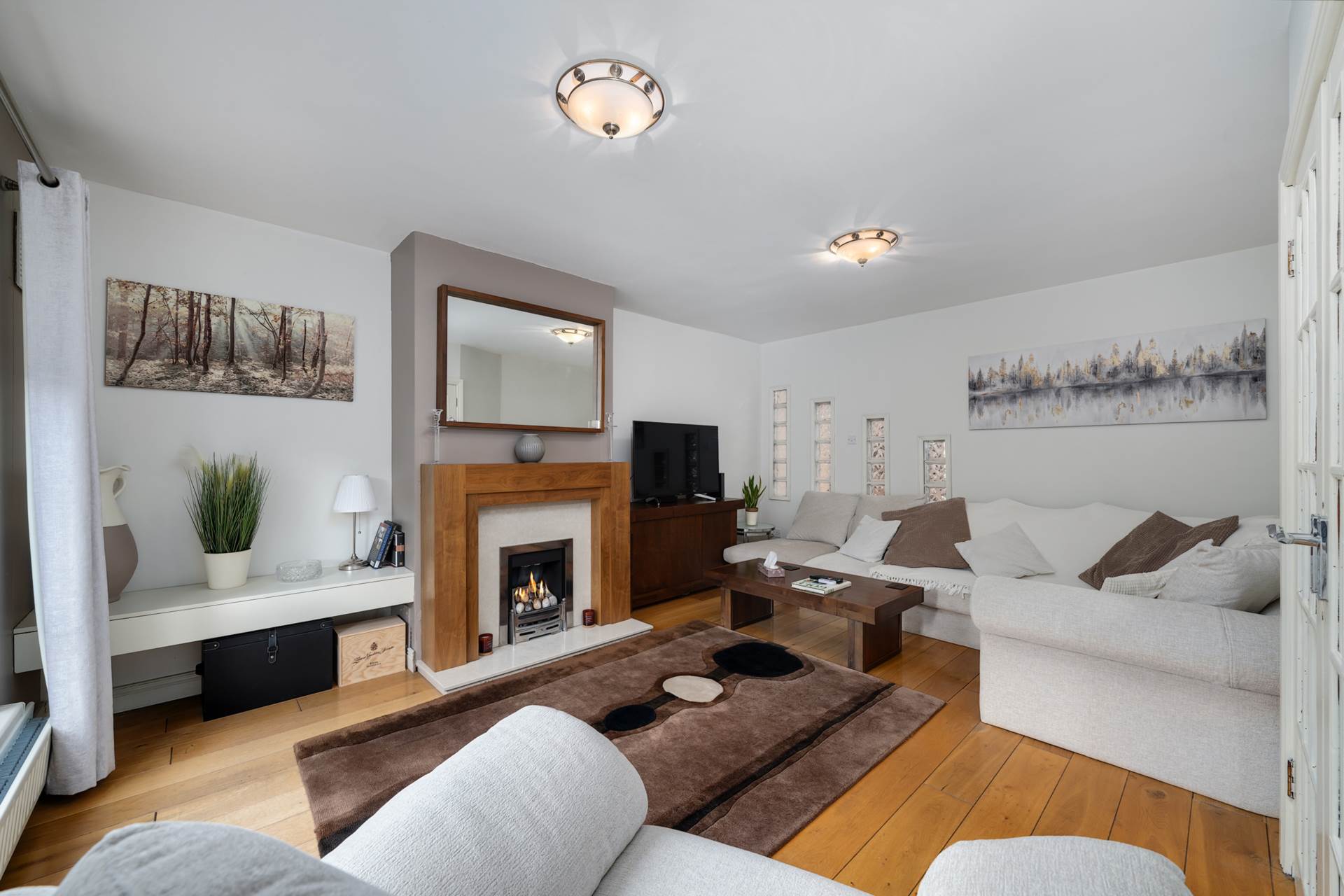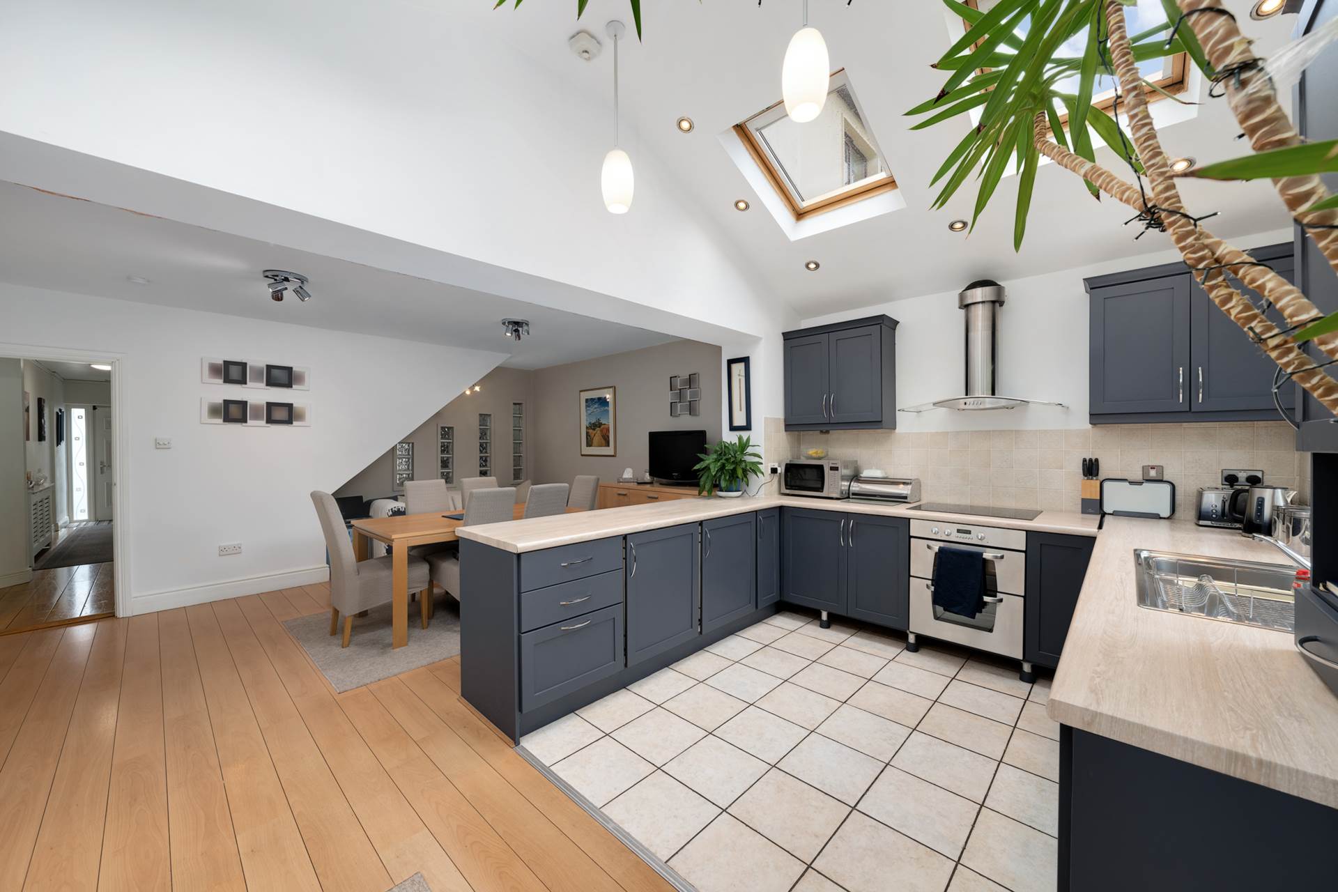 Considering the narrow facade this property is remarkably spacious. The entrance hallway stretches back 7.5m, with the beautifully proportioned sitting room opening to one side and a large kitchen-dining room privately secluded to the rear. The kitchen extension is a lovely bright space with a lofted ceiling, four skylights, patio doors and a large kitchen window looking out to the sun deck surrounded by flowers in the totally private back garden. The kitchen comes fully equipped with the full range of appliances, a breakfast bar and plenty of counter space.