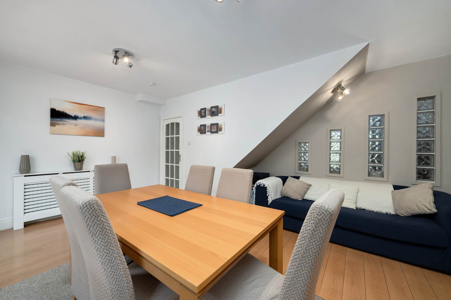 Extended kitchen/dining area with high quality wood laminate flooring in the dining and breakfast bar areas and tiled flooring in the kitchen. The area under the stairs is currently used as a seating area with vertical glass block panels allowing light through between here and the sitting room.