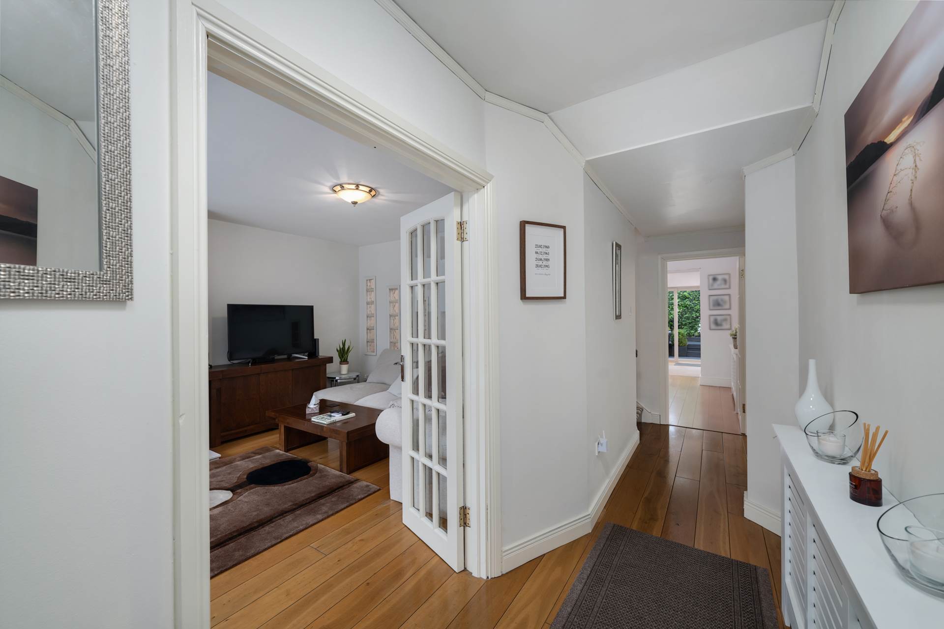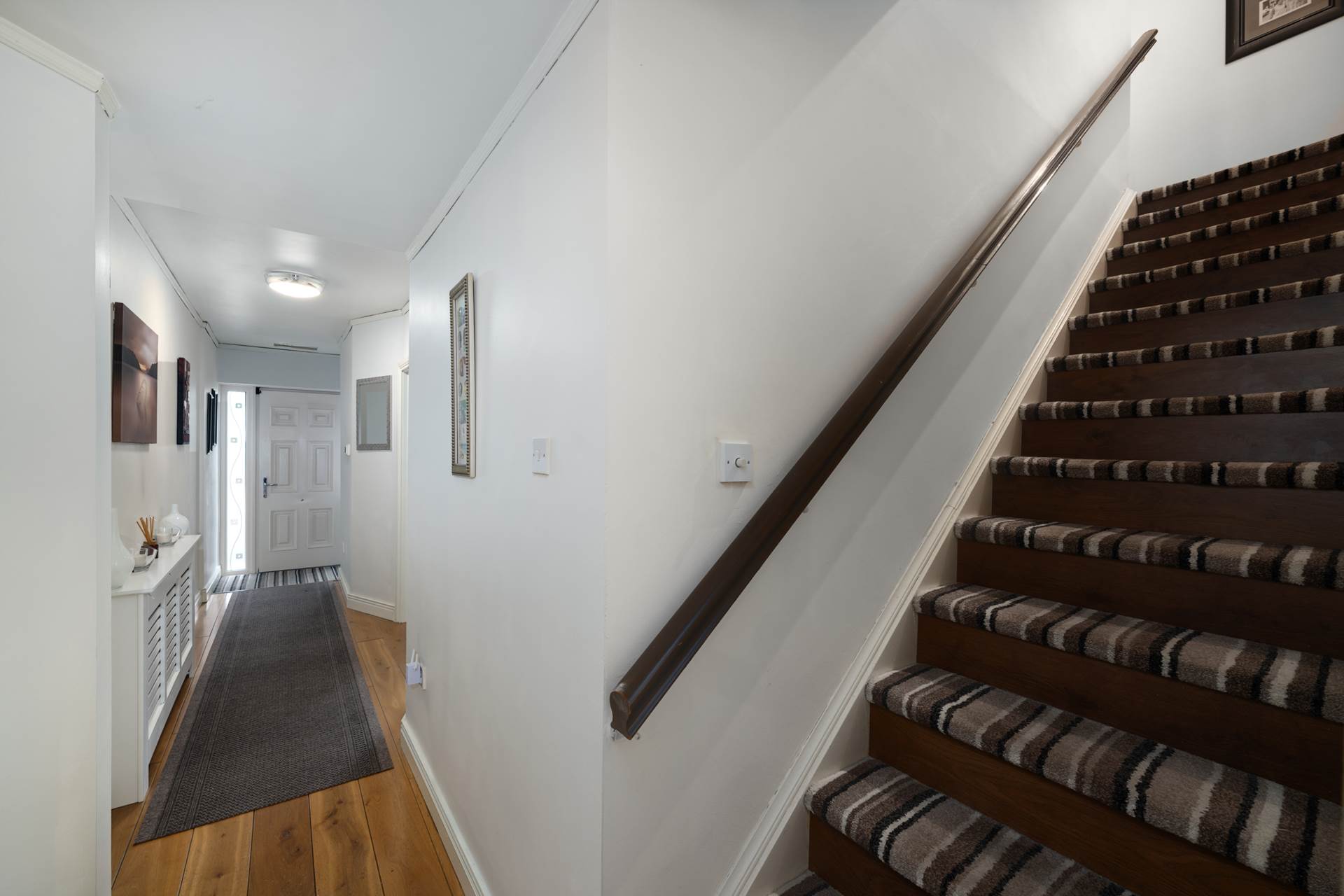 Lengthy entrance hall leading back to the kitchen/dining room at the back of the property. Triple locking front door with frosted double-glazing either side - new in 2024. Solid wood flooring (French oak). Coat hooks. Carpeted stairs.