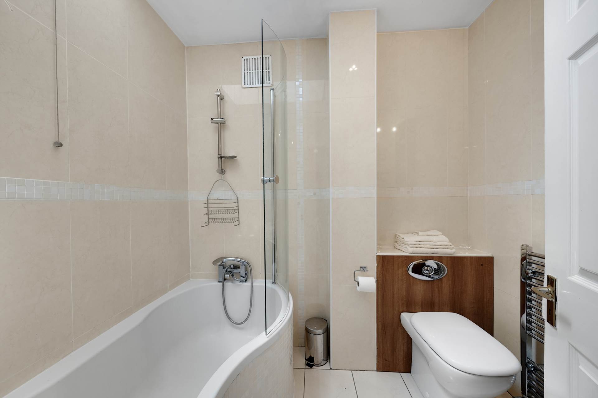 Fully tiled. Bathtub with shower fitting and glass shower screen. WC with hidden cistern. WHB with cabinet underneath. Lit vanity mirror. Heated towel rail. Skylight. Vent.