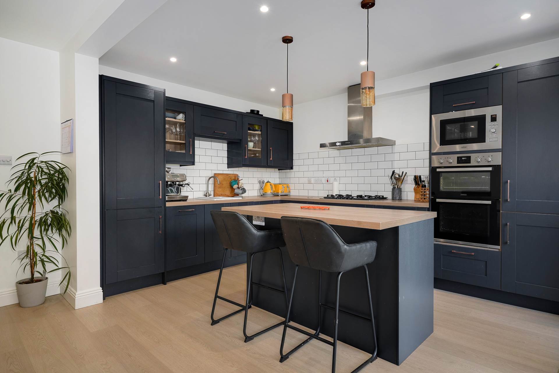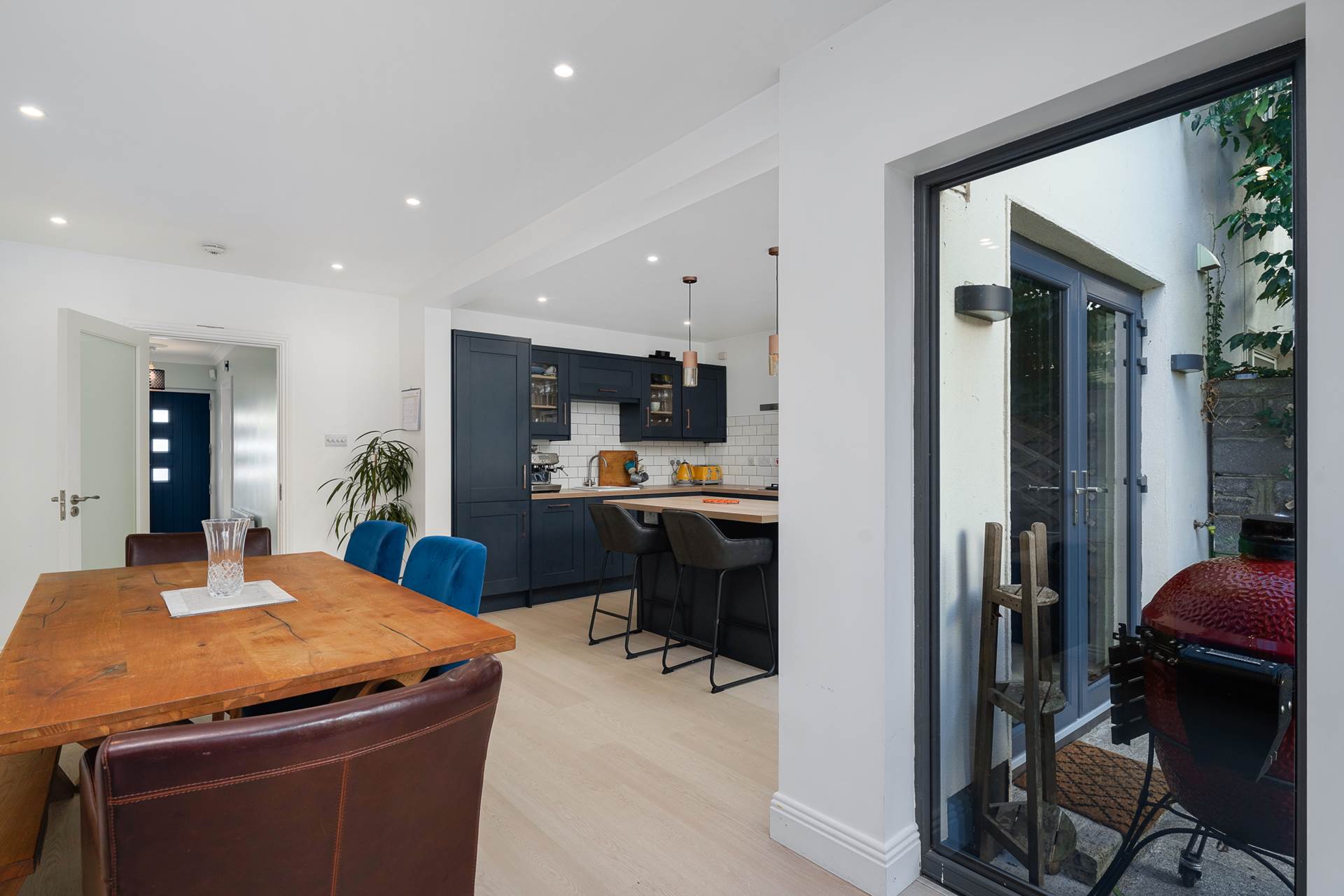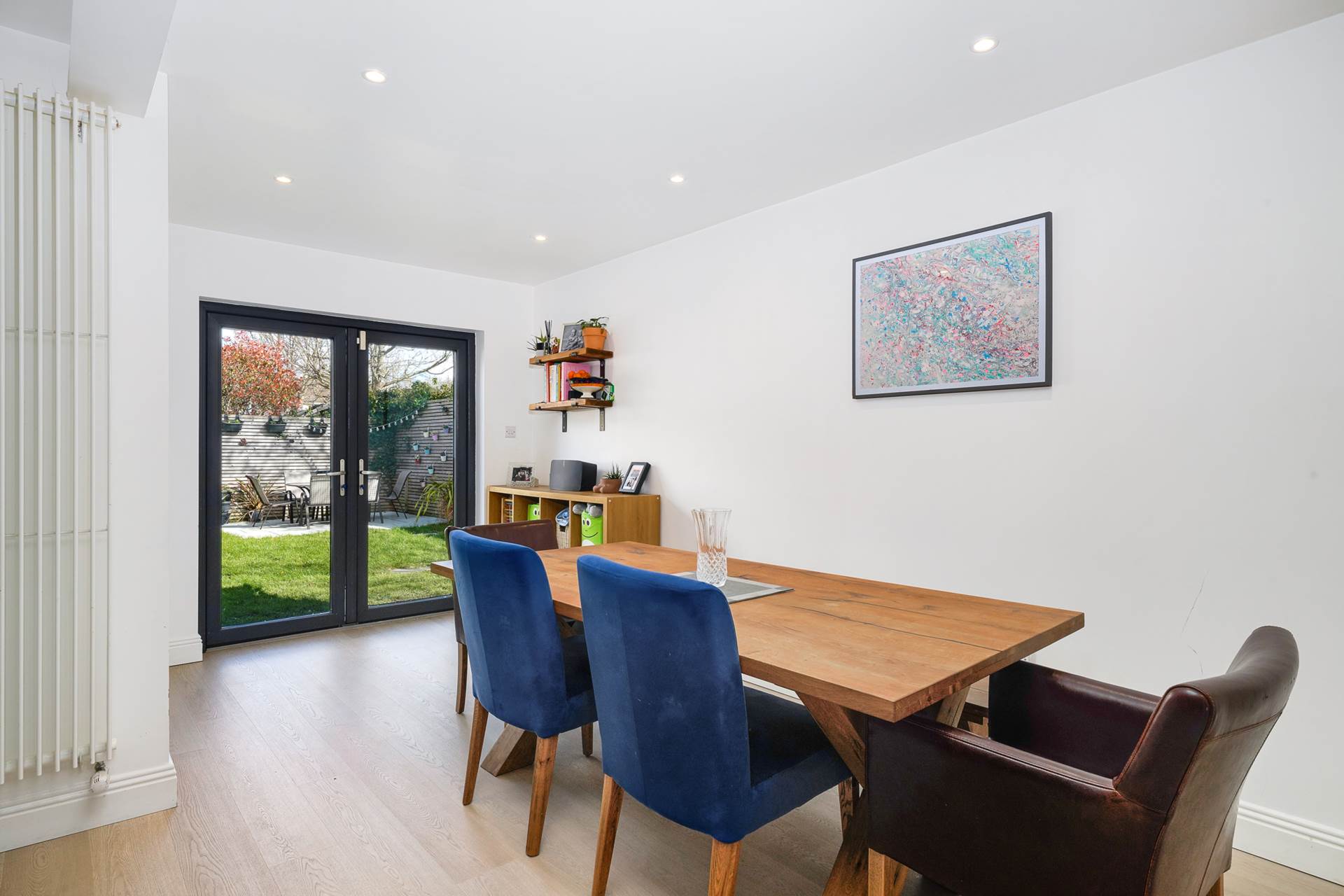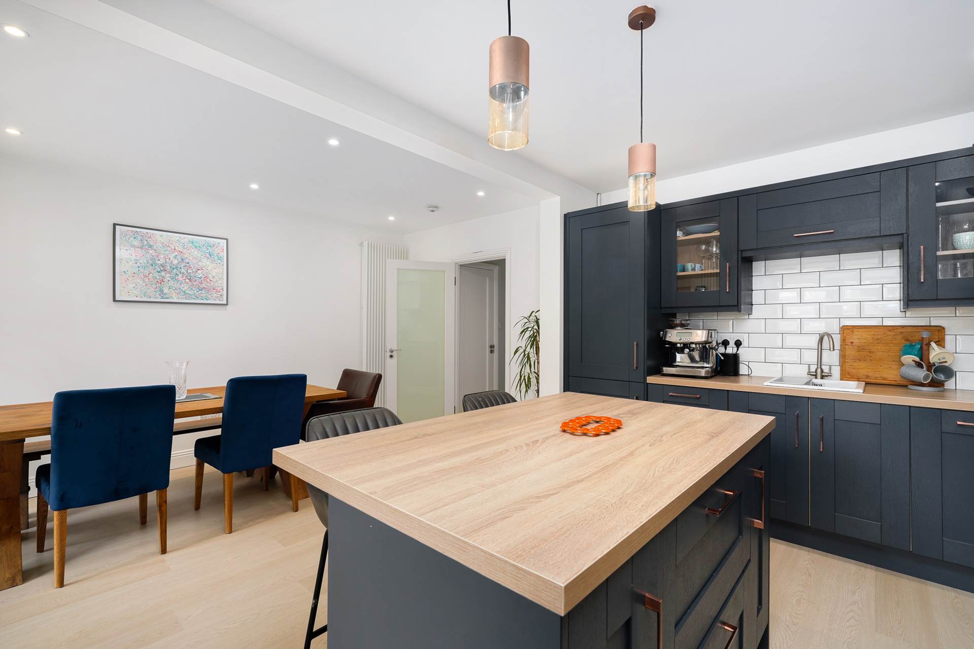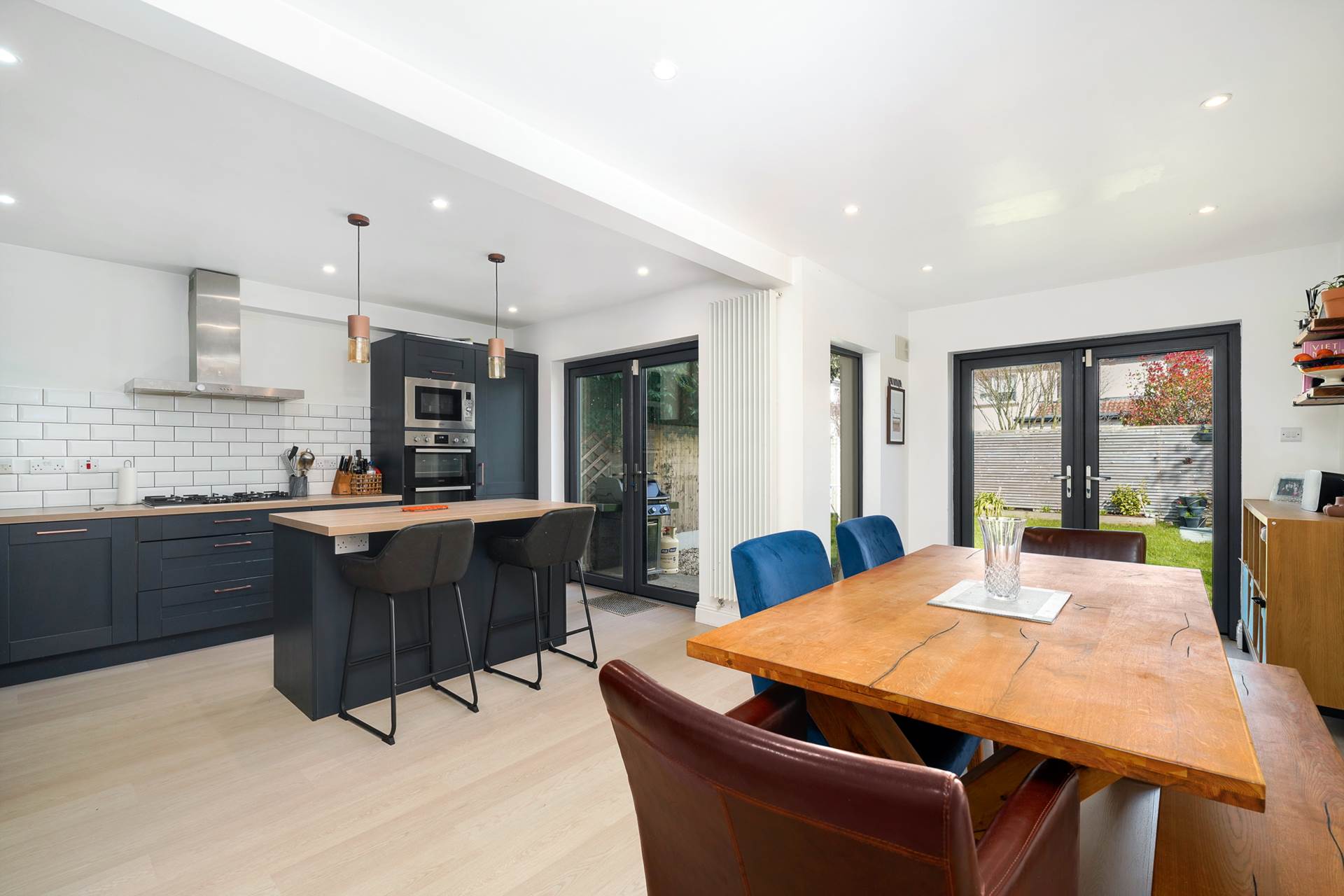 Open-plan kitchen/dining room. Two sets of triple-glazed French doors open to the spacious back garden. An additional triple-glazed pane lets in even more light.The dark blue kitchen units contrast beautifully with white marble counter tops, the white ceramic sink, and the white subway tile splashback. Integrated appliances included in sale - 5 ring gas hob, stainless steel hood, eye-level electric oven and microwave, dishwasher, fridge-freezer, Island unit with two-seater breakfast bar and overhead light fittings. Recessed lighting. Modern vertical radiators. Bin drawer. 2 x display cabinets. Spacious dining area.