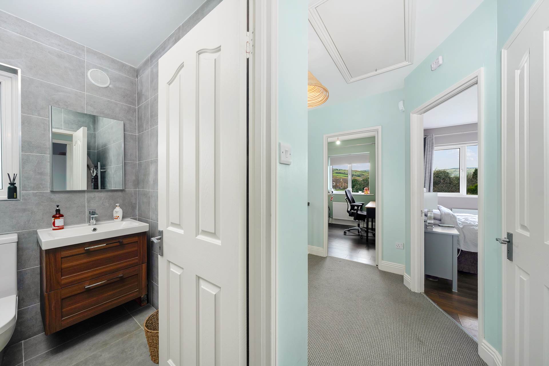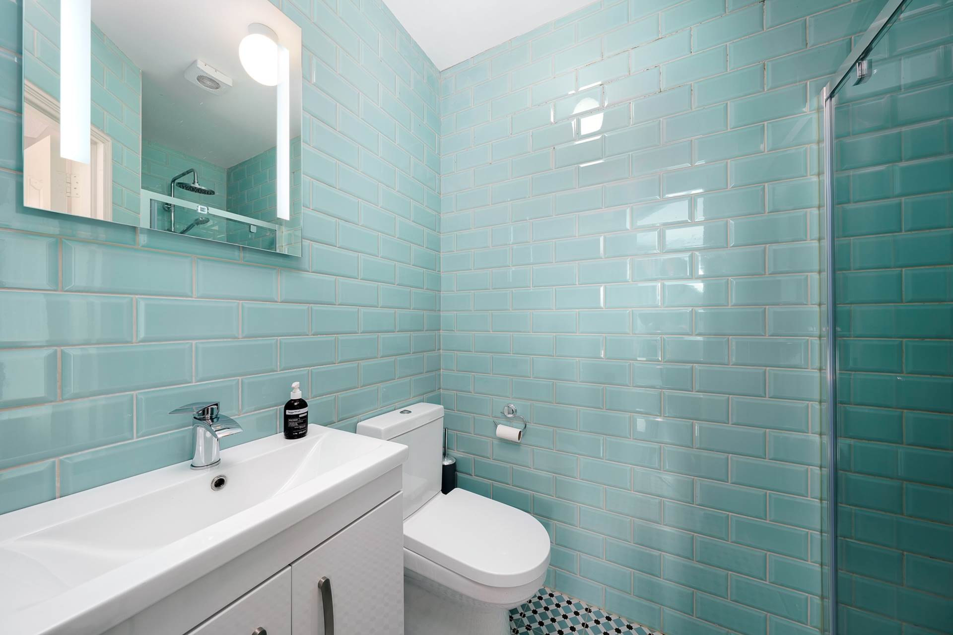 Attractively tiled - turquoise subway wall tiles matching beautifully with the turquoise pattern in the floor tiles. New white suite with WC, WHB and walk-in Shower. High flow shower head. Lit vanity mirror.Under WHB cabinet.