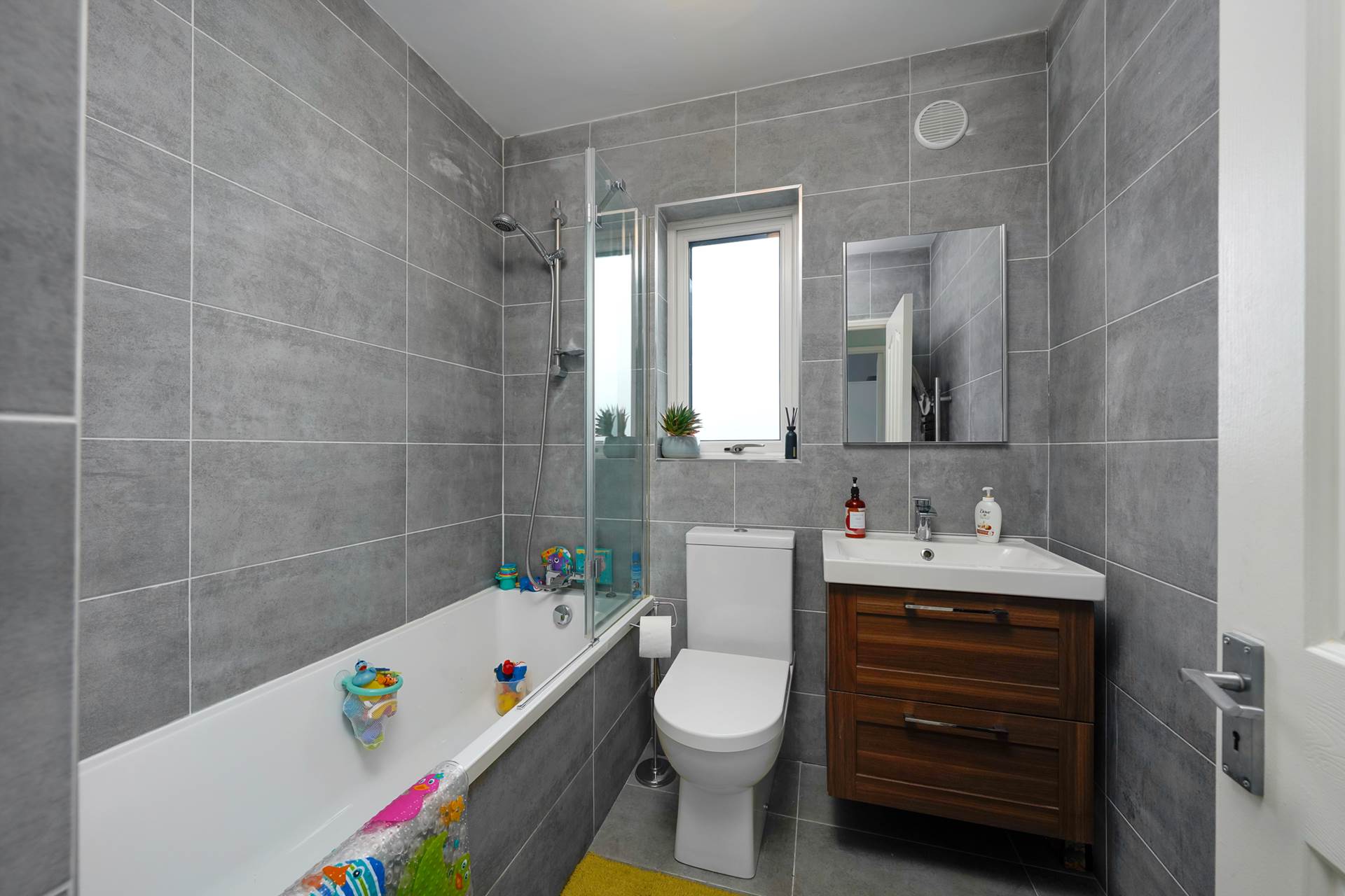 Fully tiled. New white suite WC, WHB, Bathtub with shower fitting and glass shower screen. Heated towel rail. Vanity mirror.Under WHB cabinet. Frosted glass window. External vent.