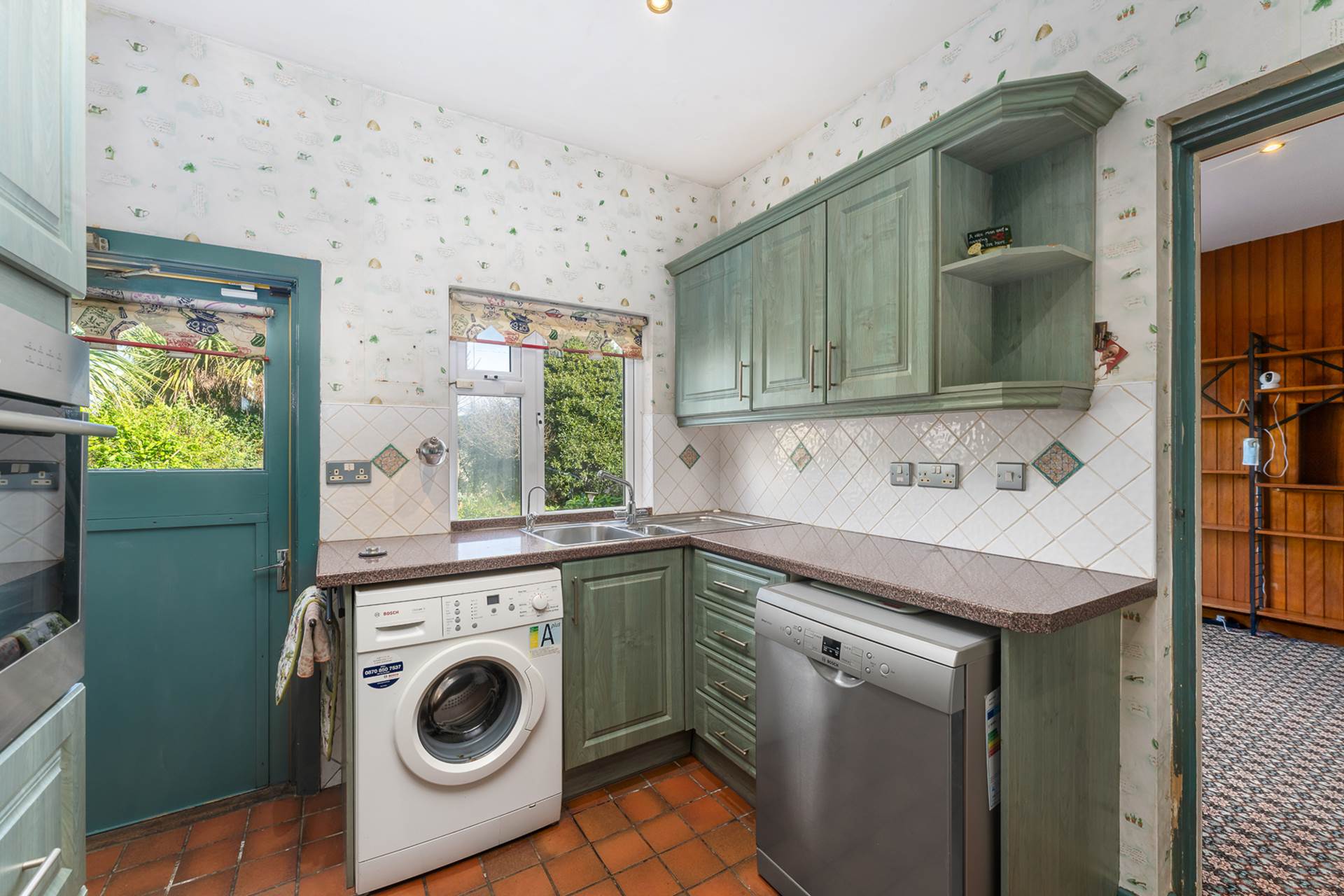 Fitted kitchen equipped with dishwasher, washing machine, fridge-freezer, eye level oven and separate hob. Door and kitchen window to back garden. Tiled floor. Tiled splashback. Vertical radiator.