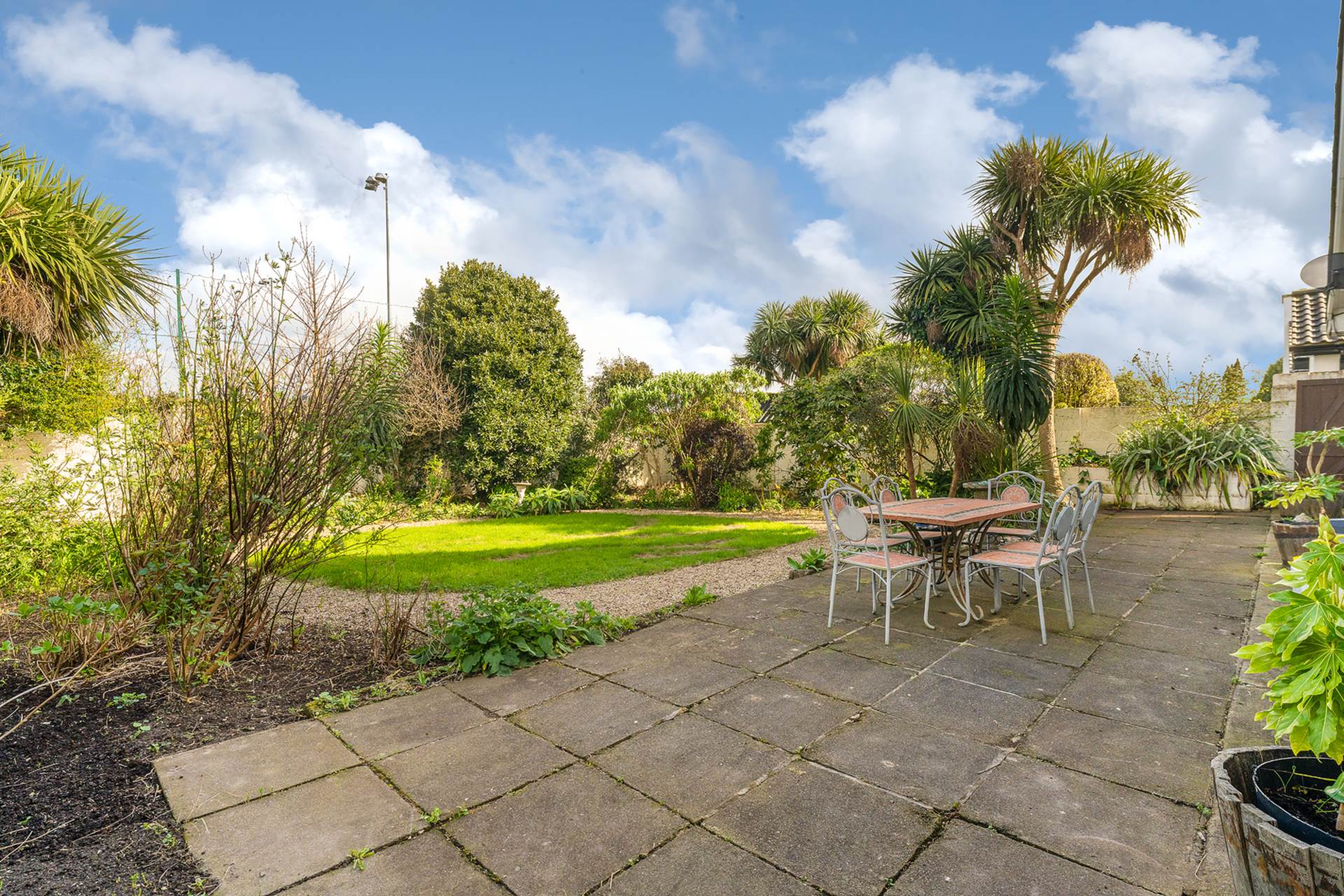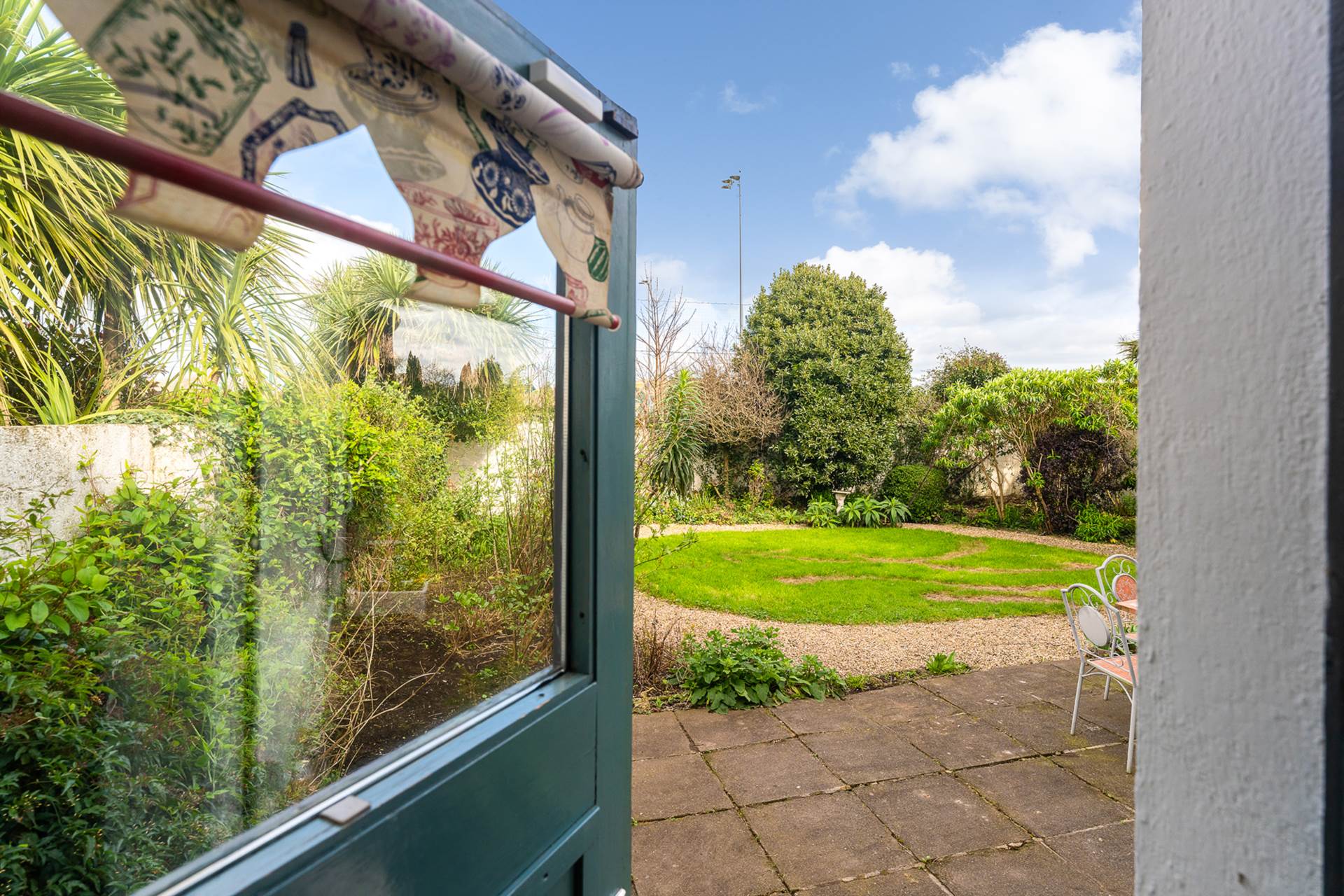 Spacious back garden with cobble-locked patio area by the house, Oval lawn surrounded by planting. Sun-trap patio area in the corner facing South and West getting excellent all-day sunshine. The jasmine by the back door is just coming into flower. Backing onto the park. Not overlooked. Quiet. Well away from any road noise.
