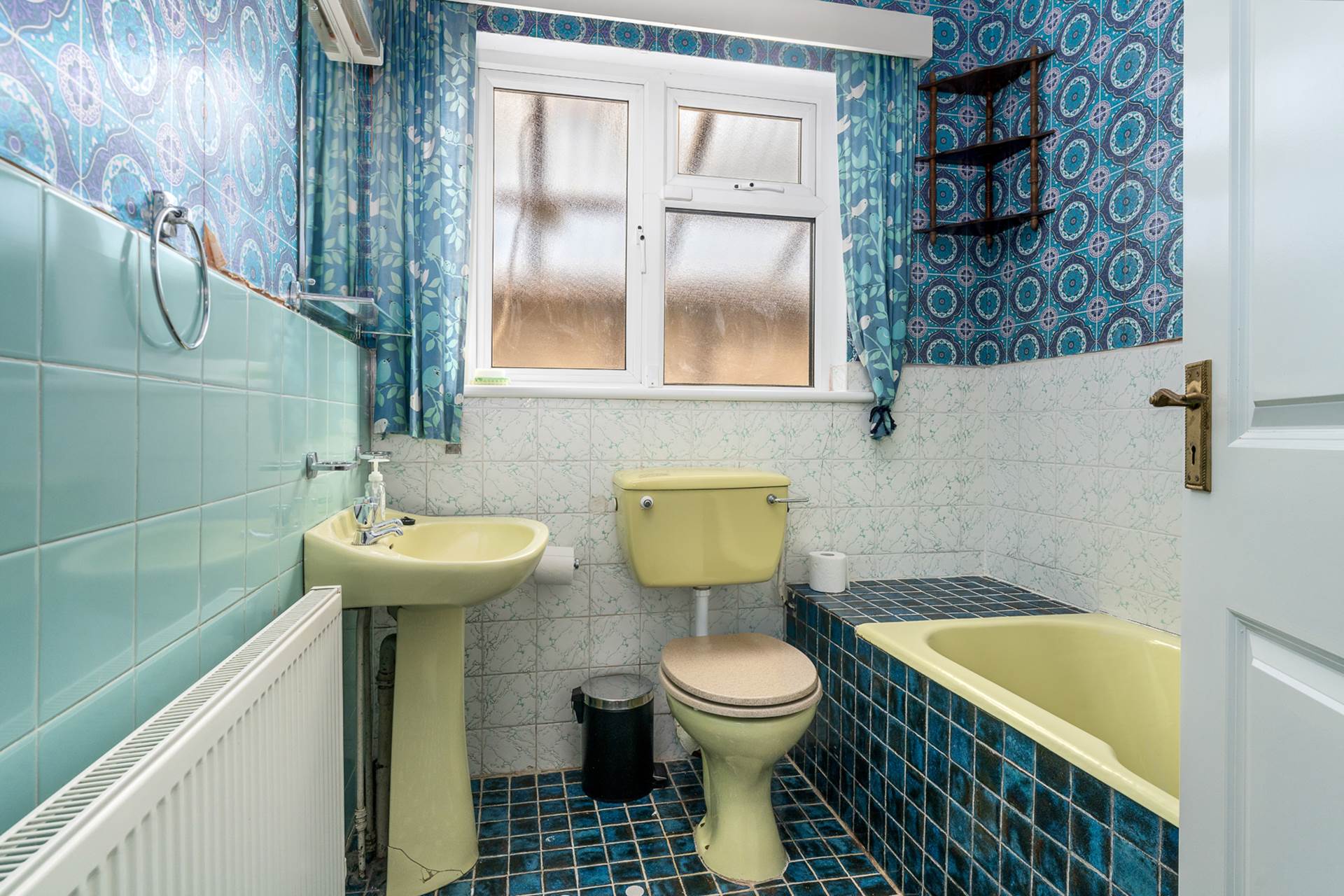 Bathtub with wall-mounted shower fitting. Pedestal WHB. WC. Tiled floor. Frosted glass window.