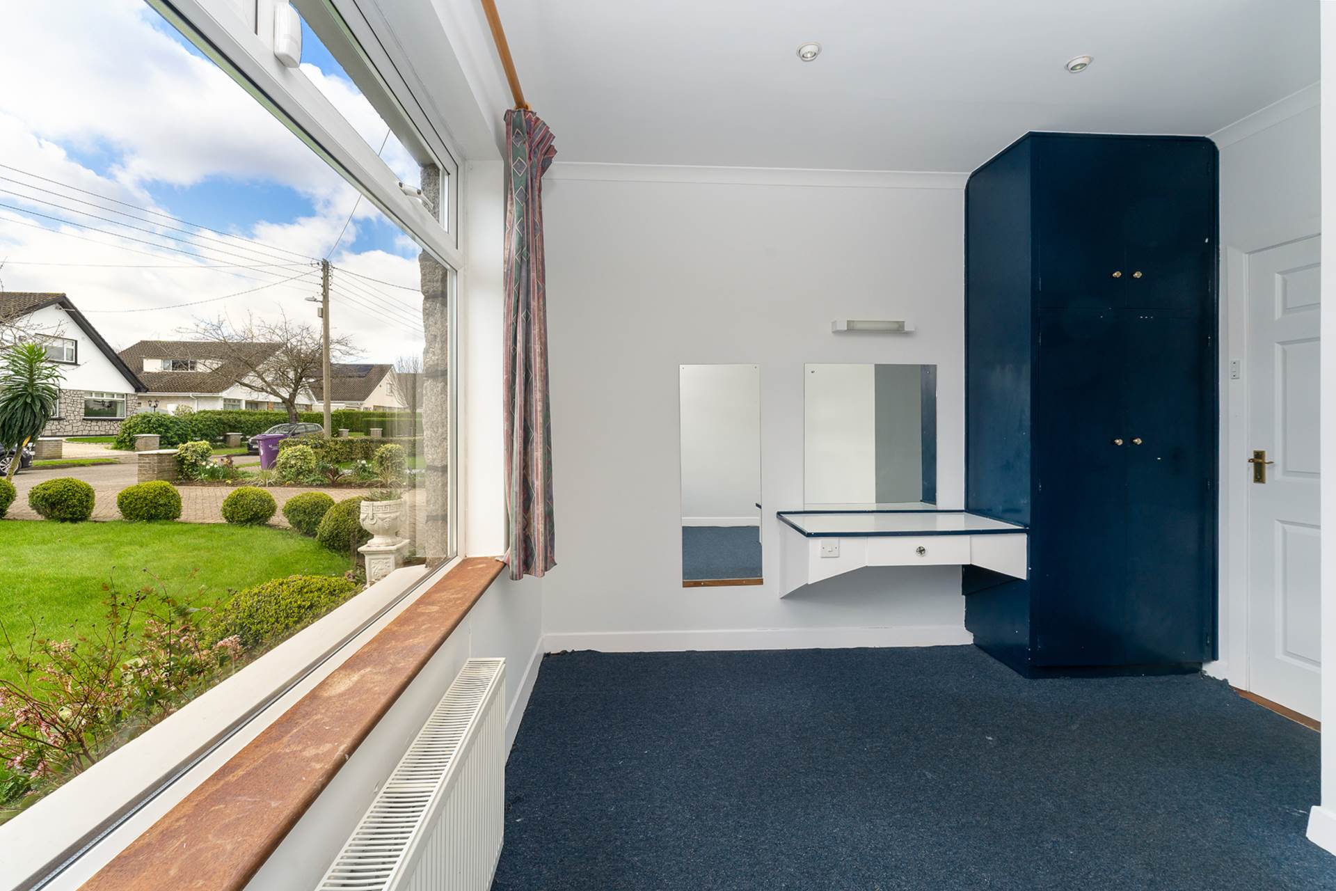 Double bedroom with a large window.Fitted wardrobe and dressing table. Curtains and curtain rod. Coving. Recessed lighting.