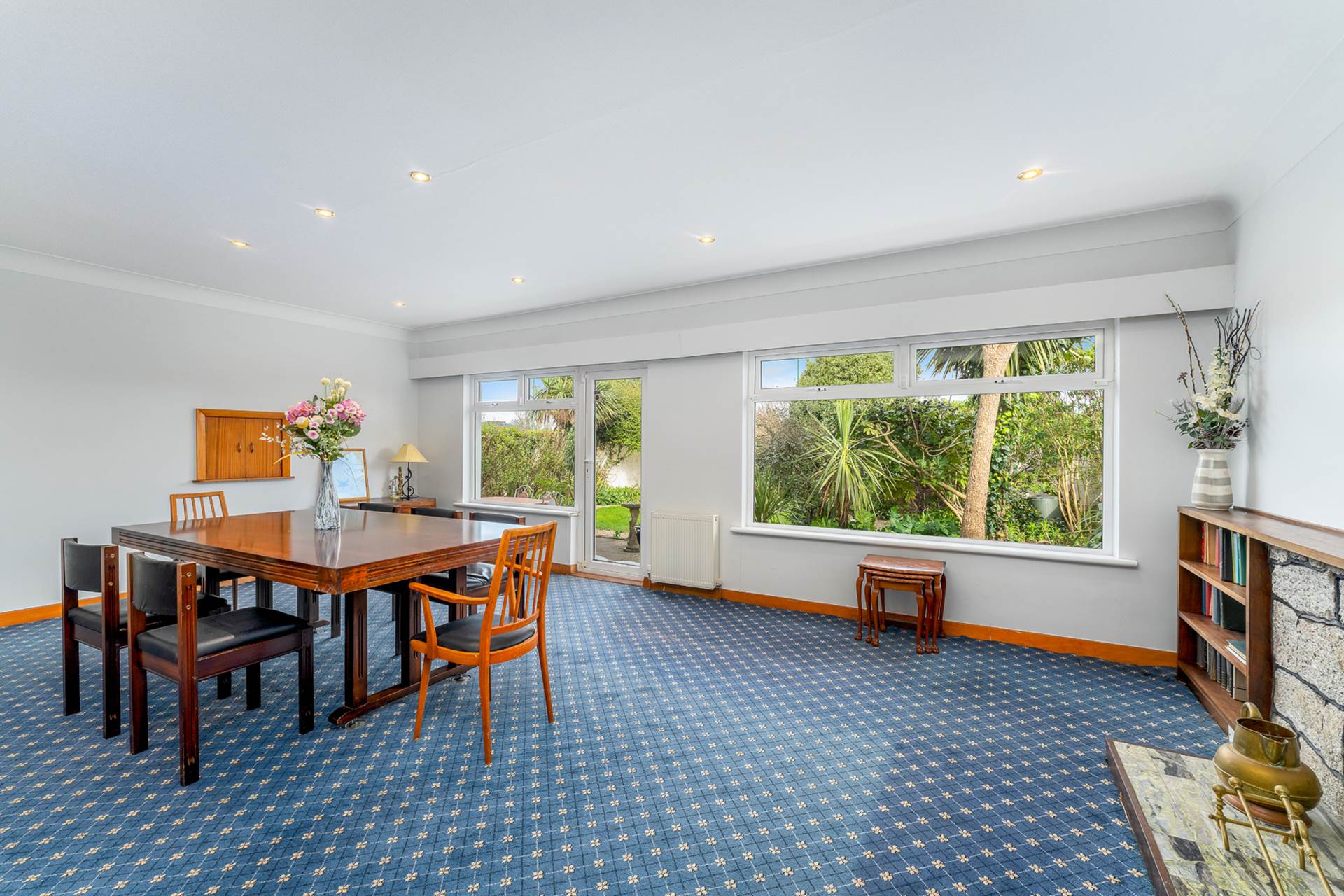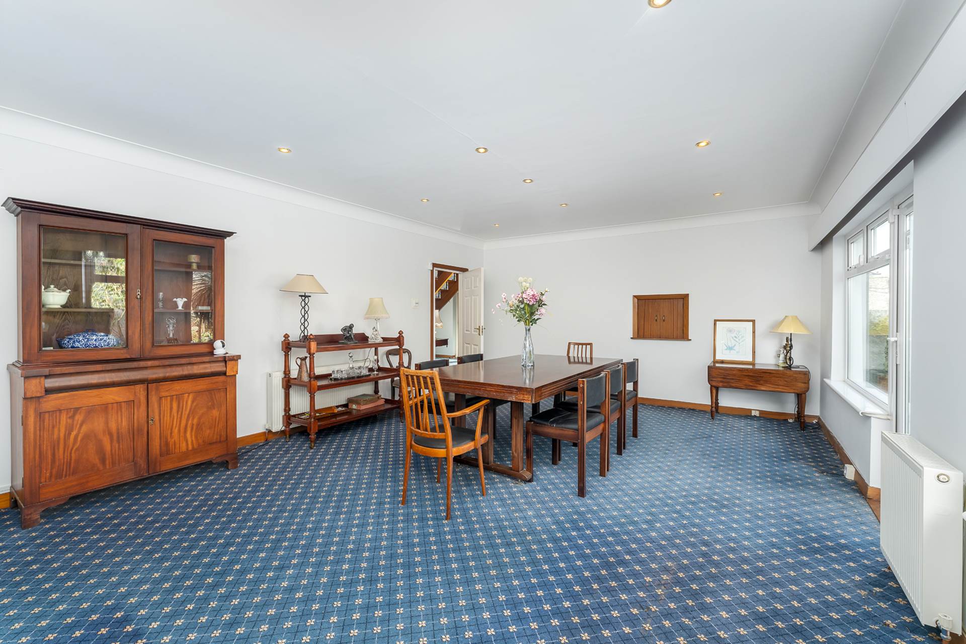 Exceptionally large living room with two windows and a glazed door to the back garden. Feature granite fireplace with Connemara marble hearth. Service hatch to dining room. Coving. Recessed lighting.