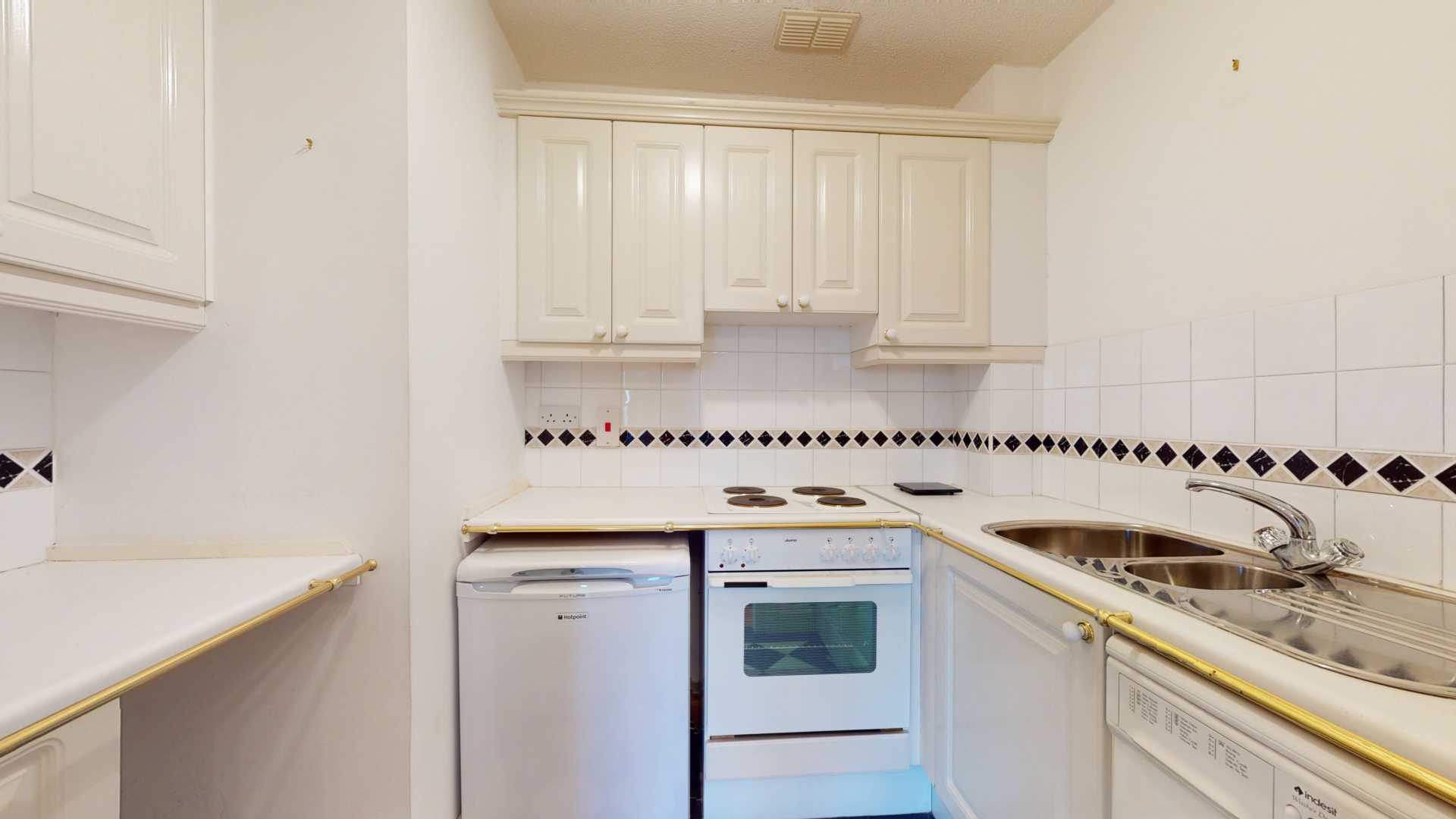 Equipped with electric cooker with hood, washer/dryer, fridge. Tiled splashback matching the black and white tiled chequerboard floor.