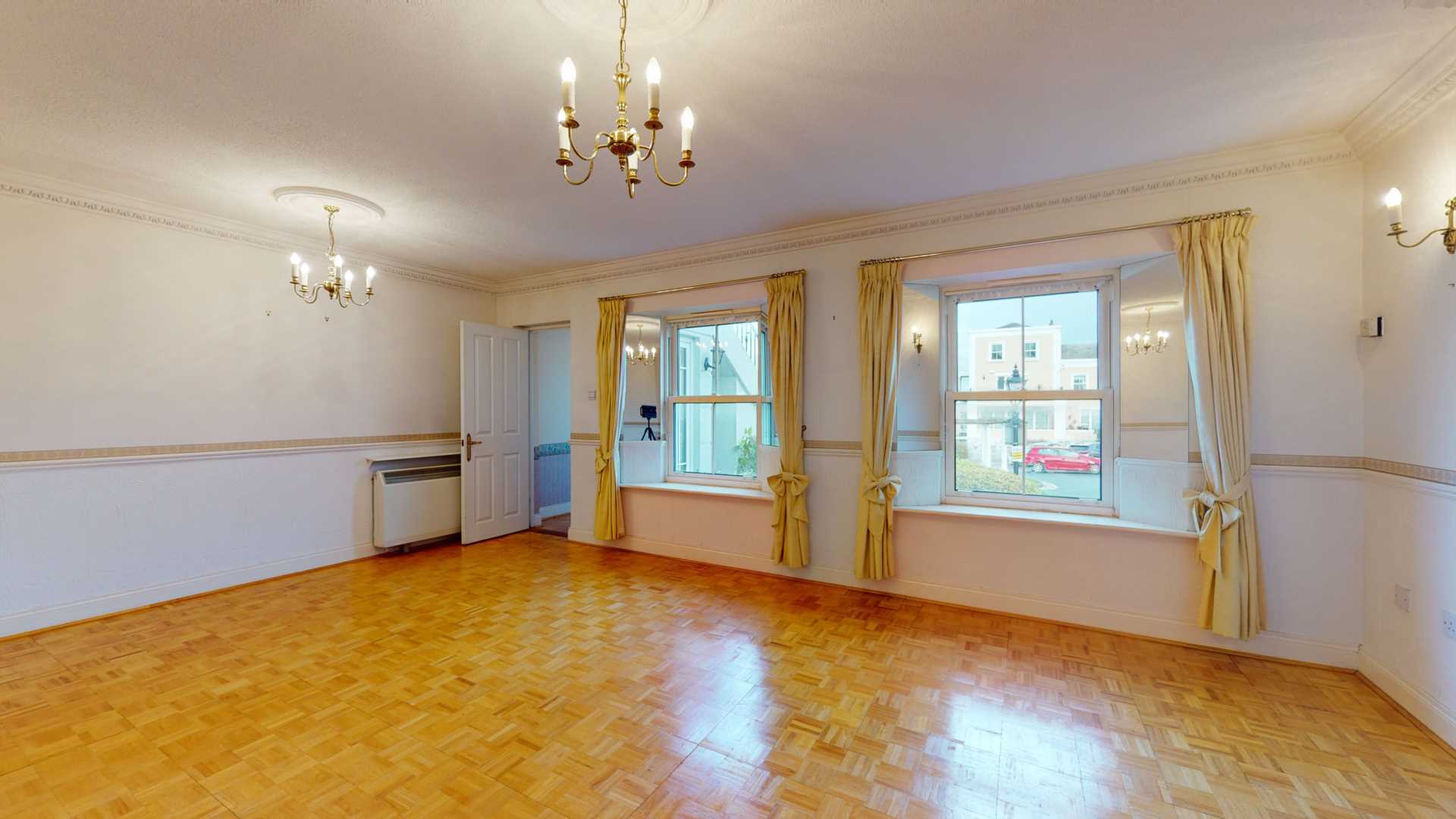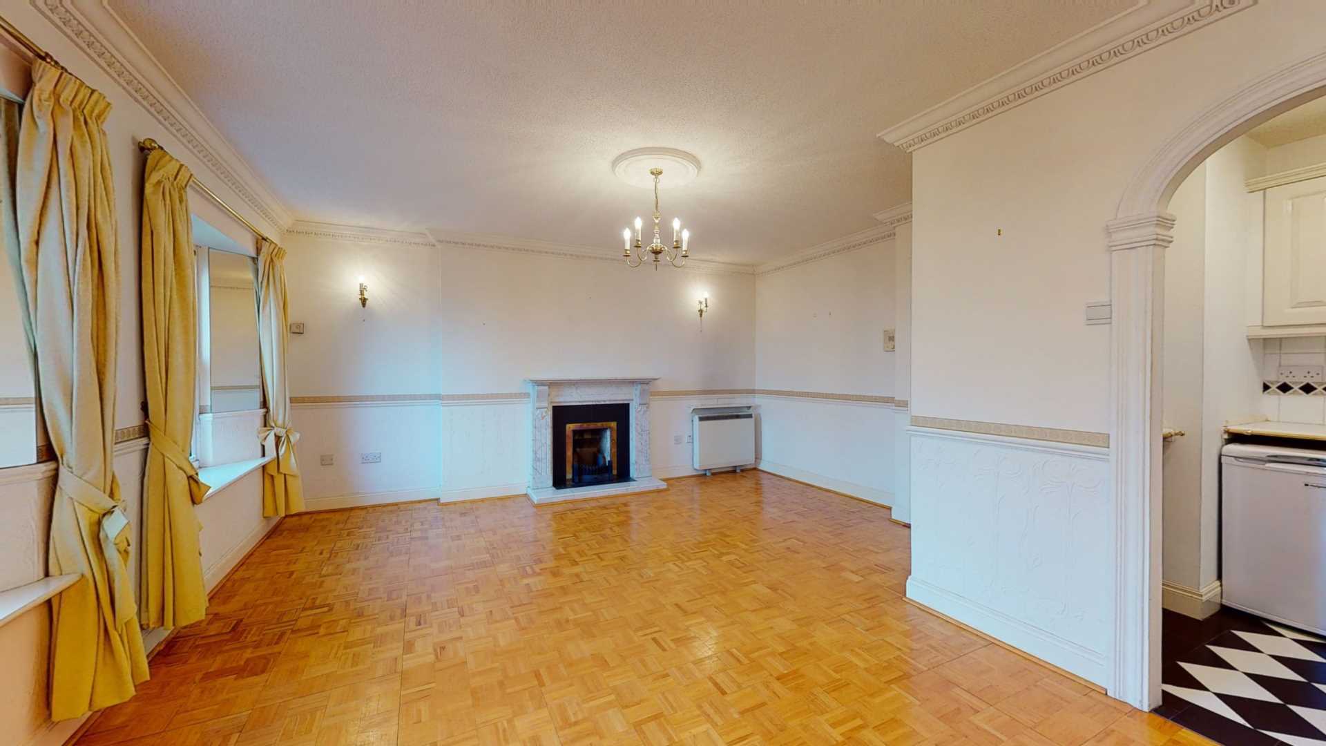 Two windows. Open fireplace. Parquet wood flooring. Two light fittings plus wall lights. Curtains. Coving. Opening to kitchen.