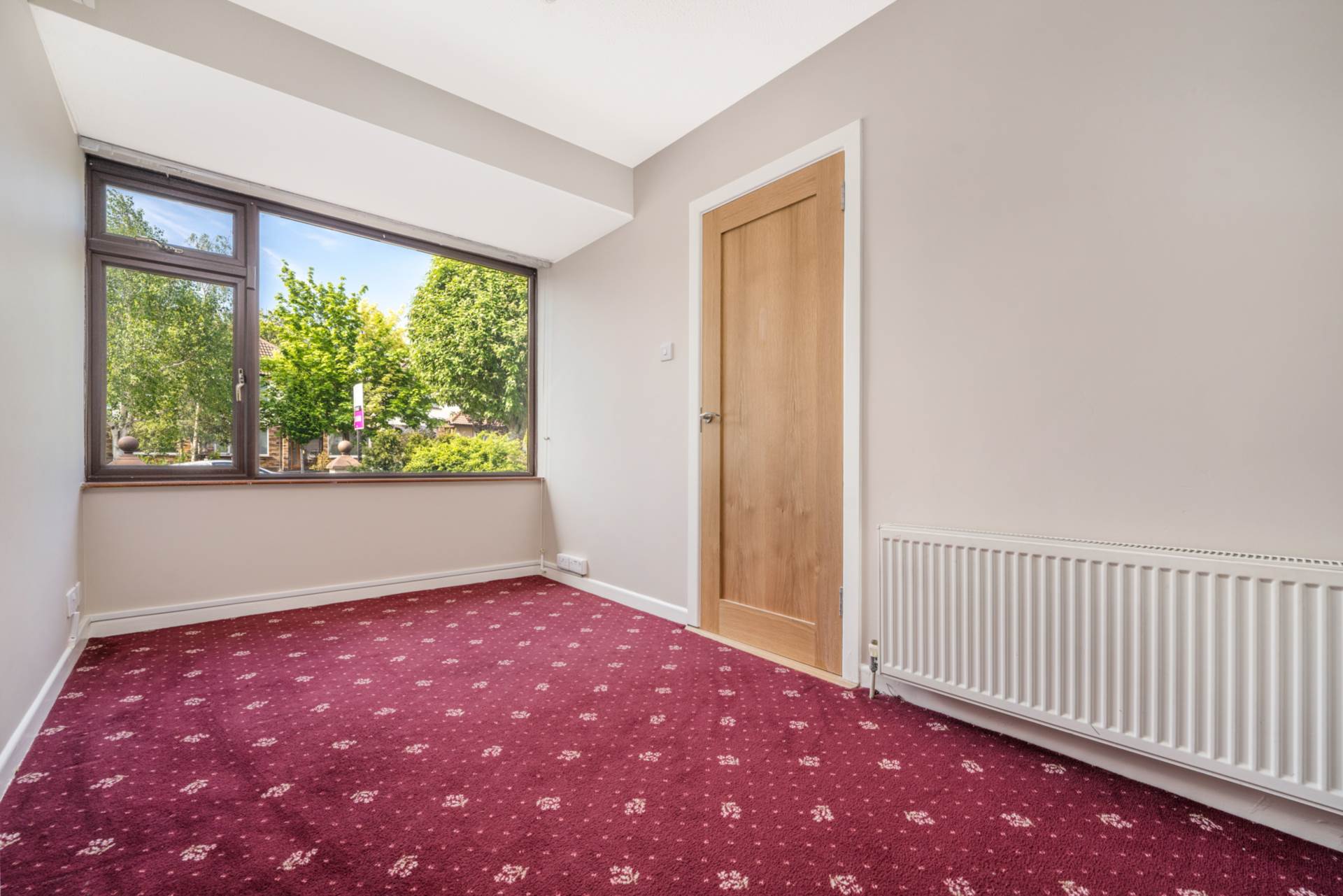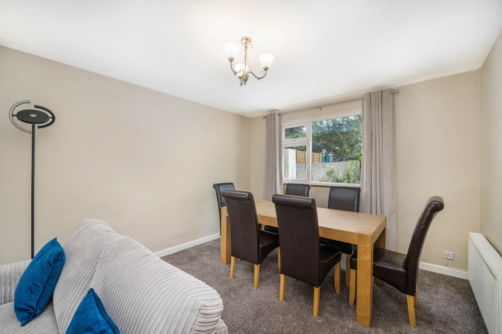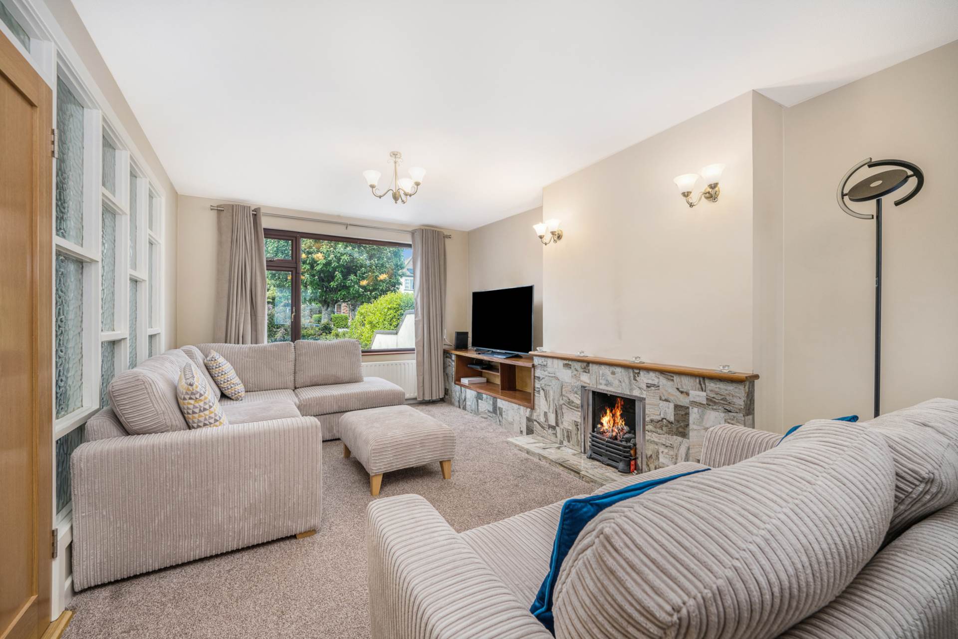 Dual aspect with large windows front and back. Marble fireplace , hearth and entertainment unit. Fitted electric fire. Carpet. Curtains. curtain rods. Virgin TV / Broadband connection point. matching light fittings and wall lights.