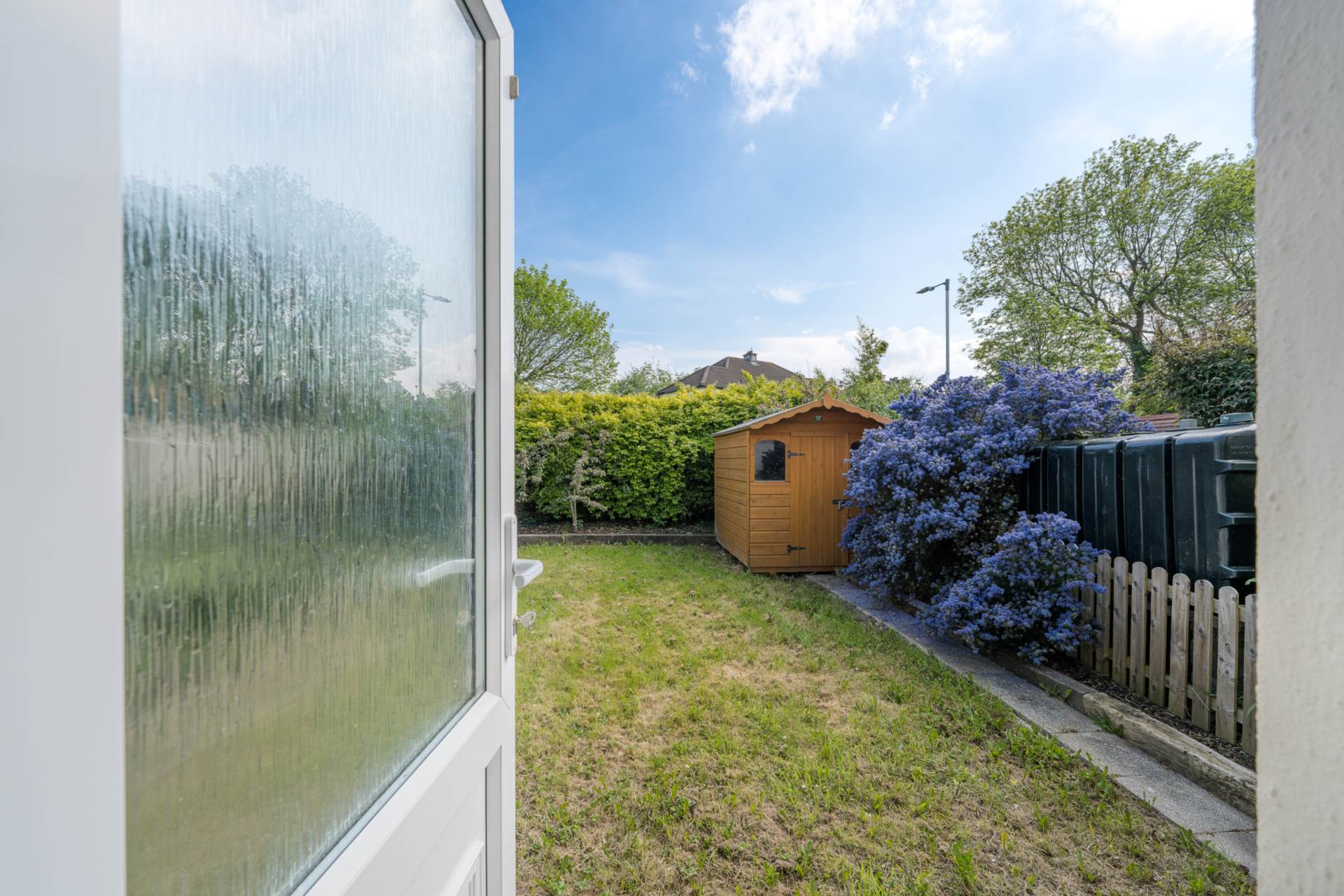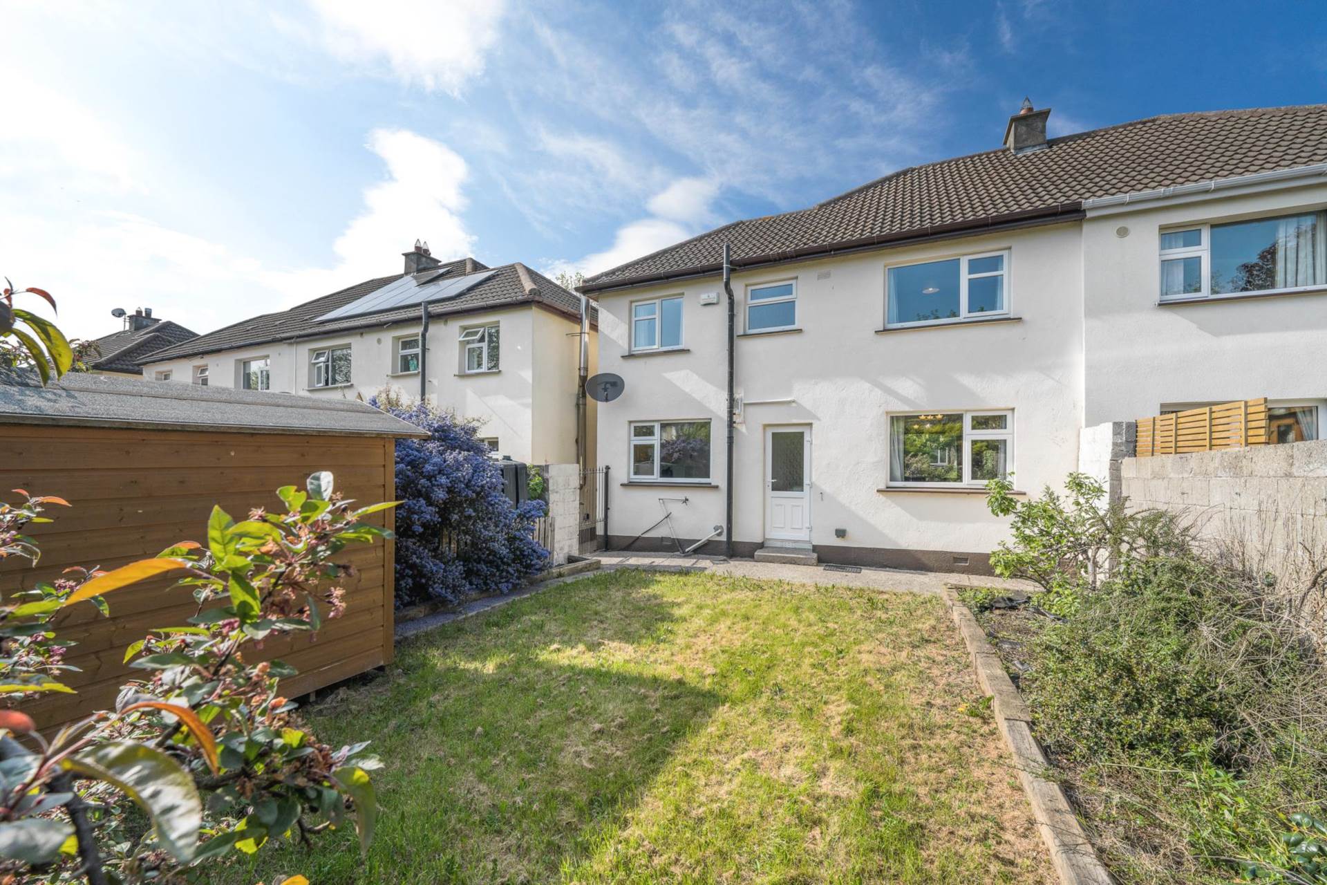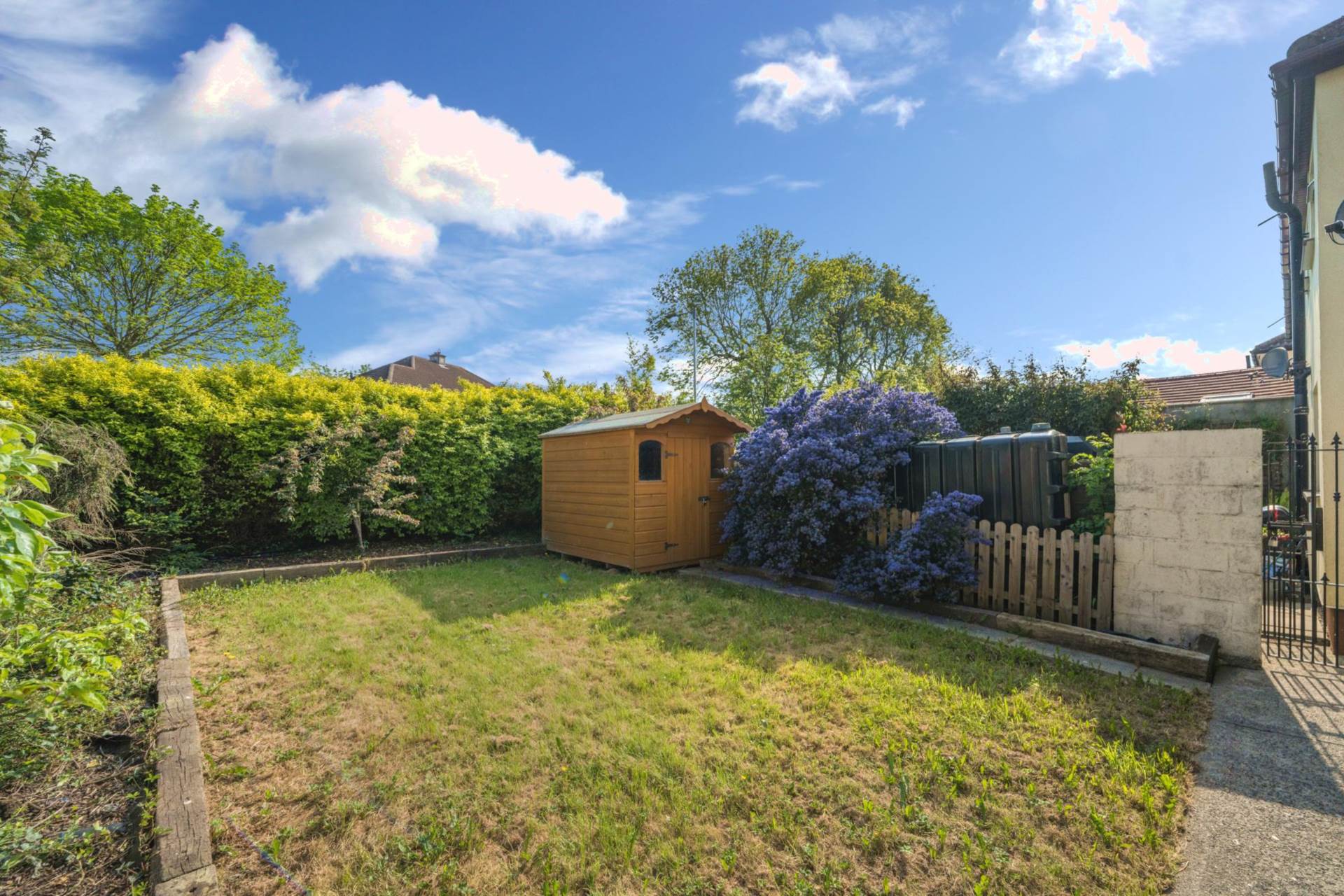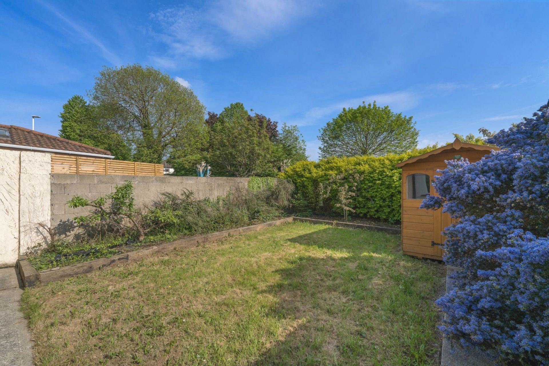Southerly facing back garden with raised flower beds on three sides each 1.3m deep. Laurel hedge along the rear boundary 2m thick. Outside tap. Outside power point. Satellite dish mounted on the back wall of the house. Garden shed 2.5m x 1.8m. Sunny back lawn. Gated side access. Shared passageway. Not overlooked.