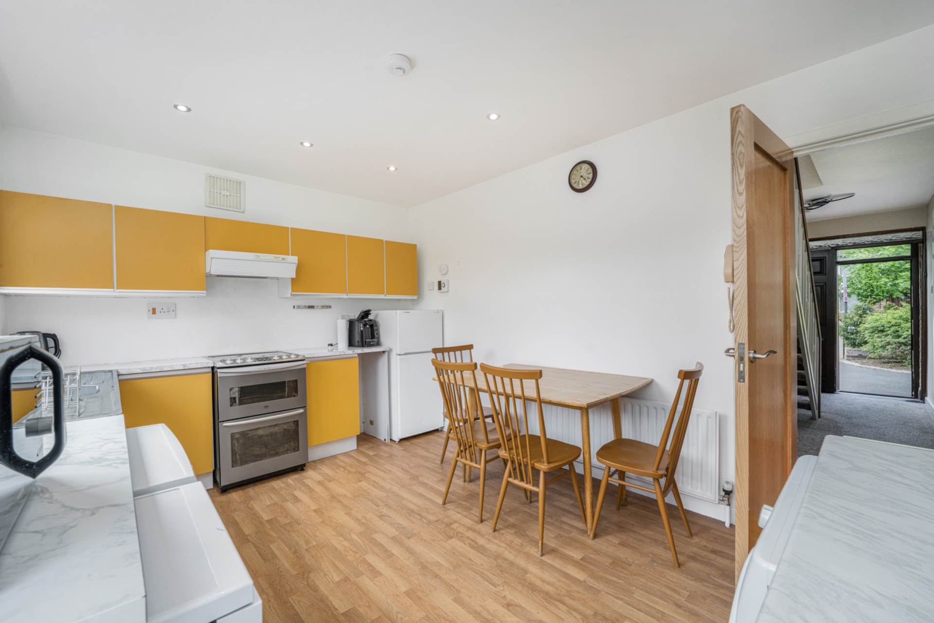 Spacious kitchen/ breakfast room with large window and back door opening to the southerly facing back garden. The cooker, dishwasher, fridge freezer, washing machine, and dryer are included in the sale. Recessed lighting. Climote control panel for heating system.