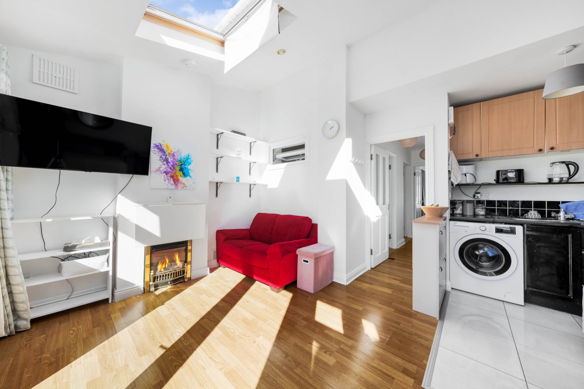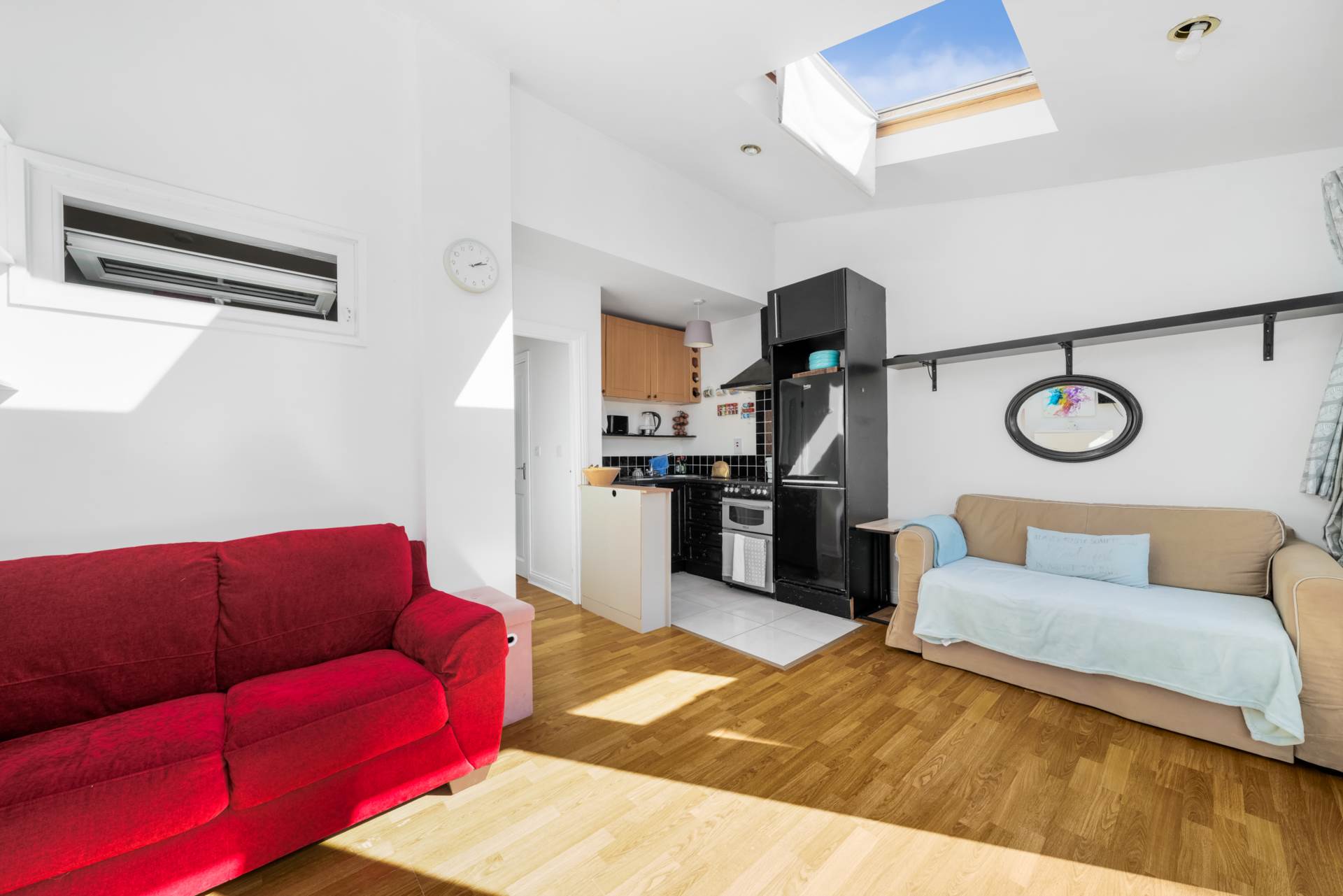 Good sized open plan living room with a skylight, feature fireplace and double doors to a private garden deck.