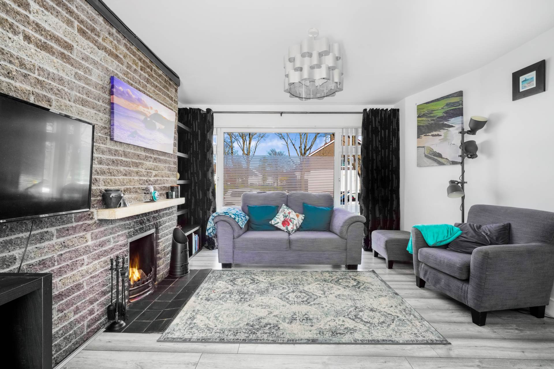 Wooden floor, feature fire place with big window showing the front of the property. Carpet Curtains and curtain rod. Opens directly into the kitchen/breakfast area.