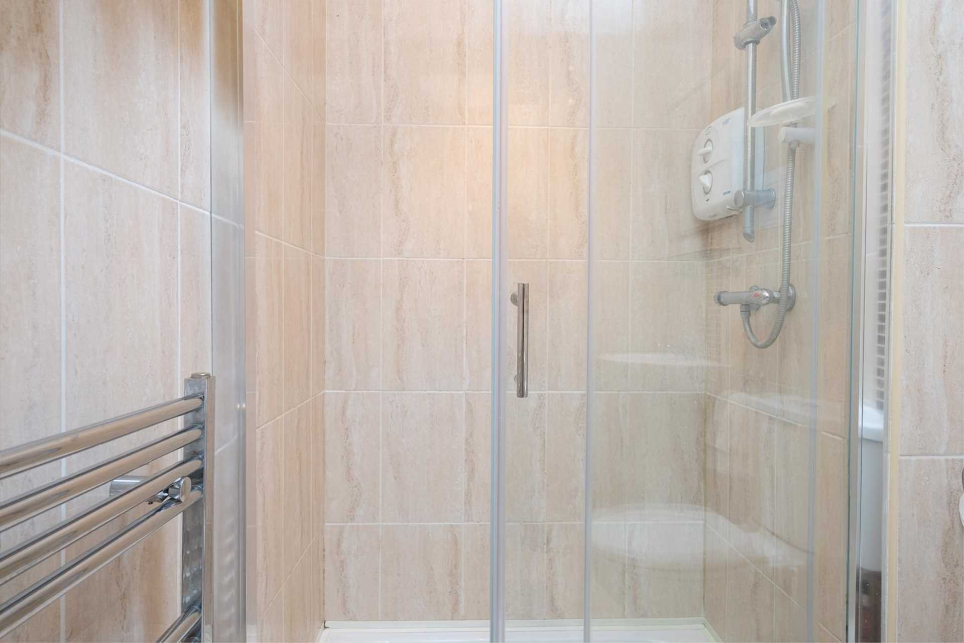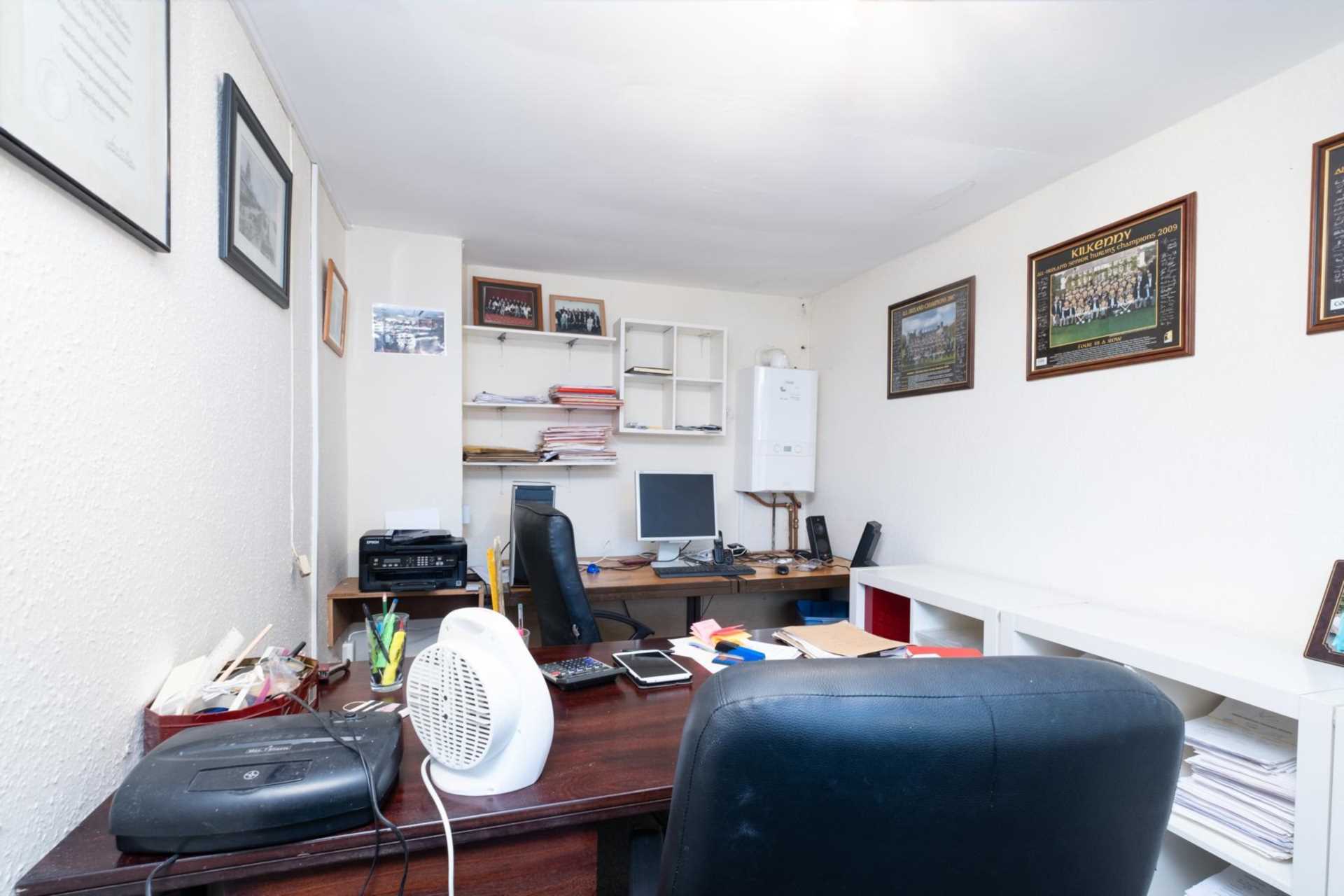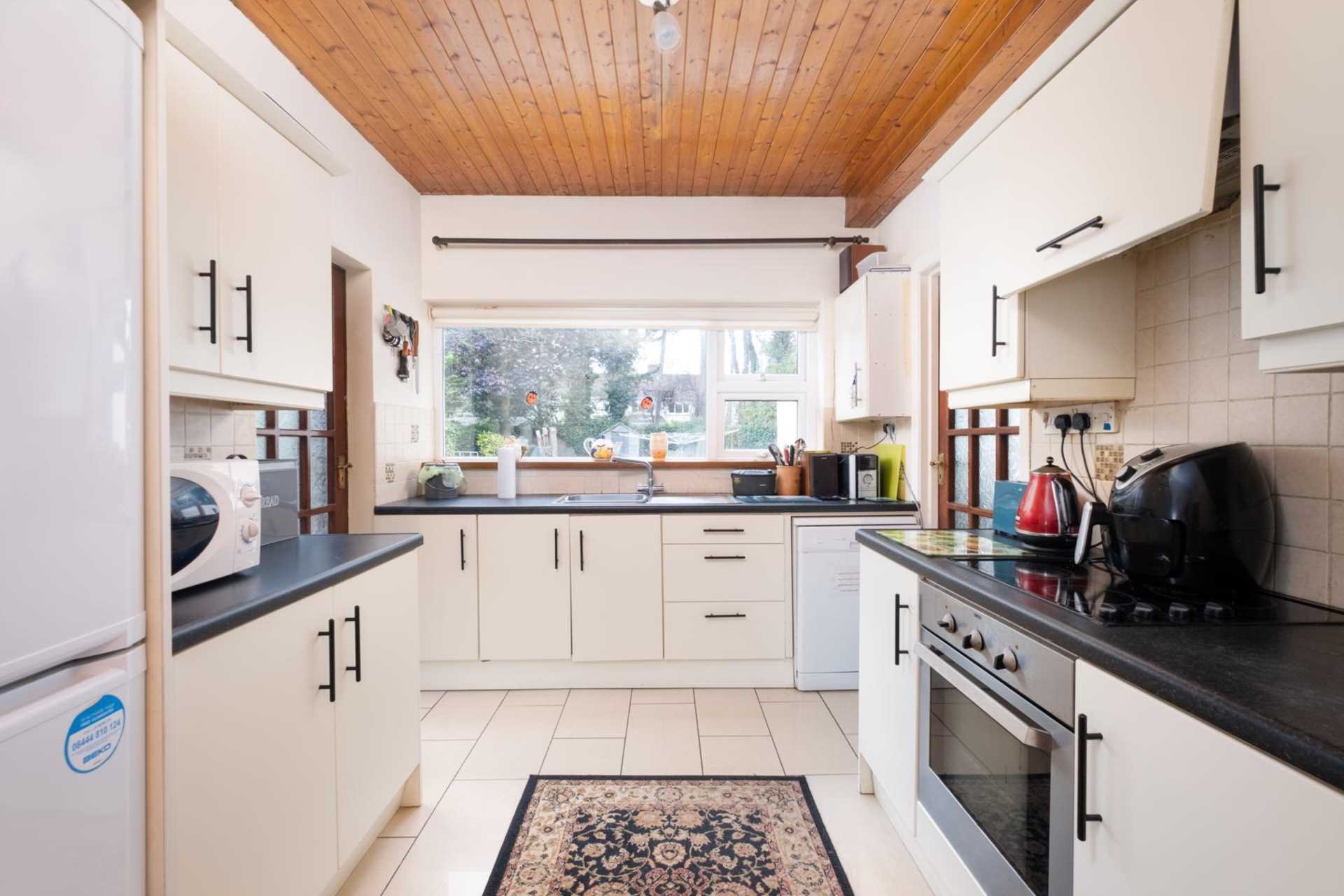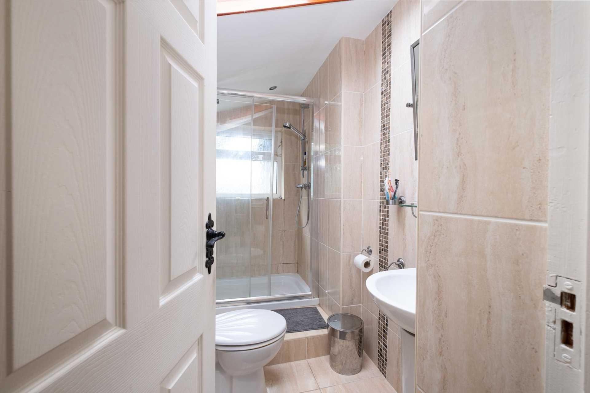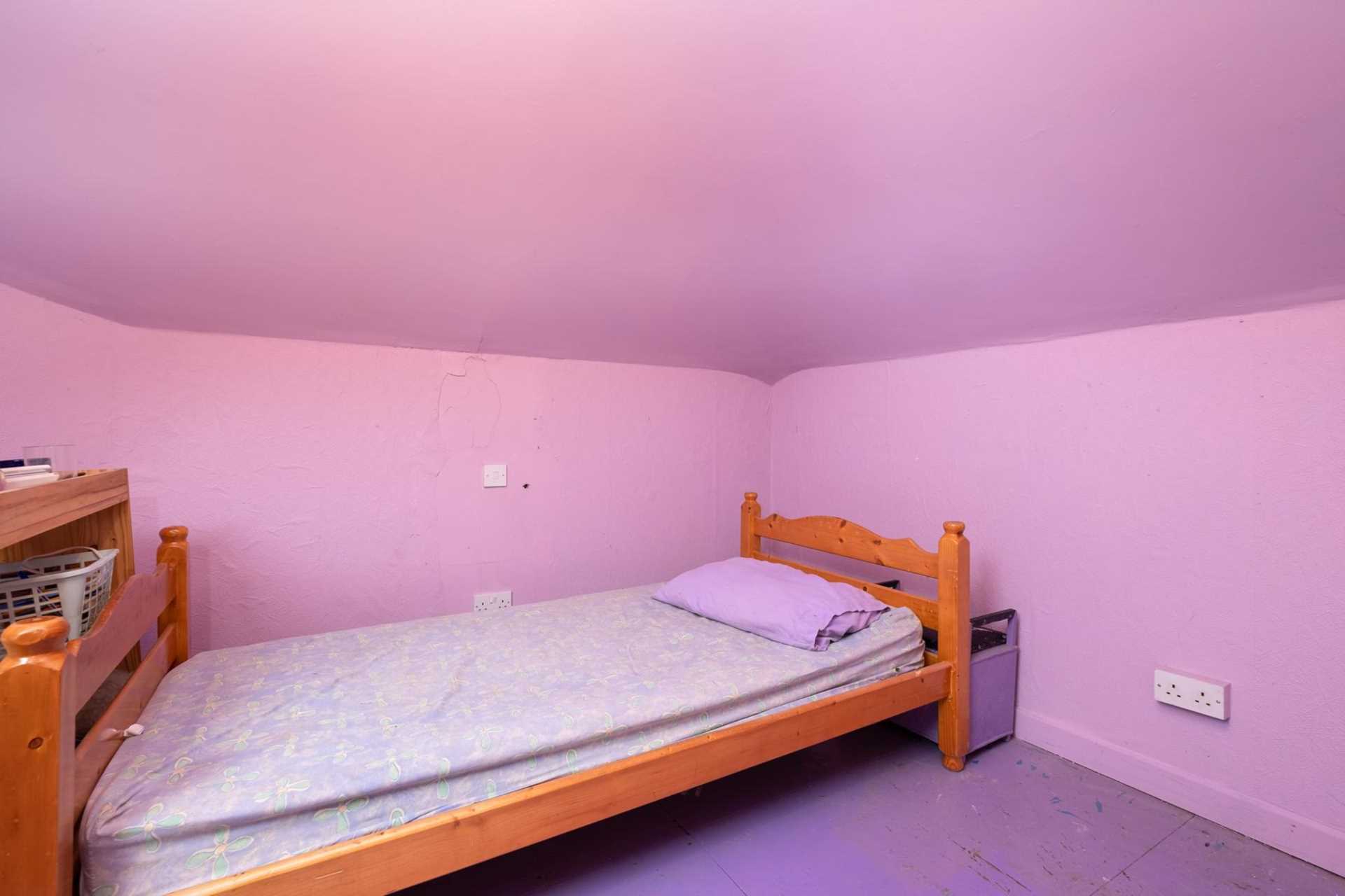 To the front, a converted garage has been turned into a home office. Upstairs are four bedrooms, three good-sized doubles and a single. There is an ensuite off the master bedroom. A slice has been partitioned off one of the largest bedrooms to give independent access to the small attic room. Re-integrating this into the bedroom would make the attic room a bonus space for the occupant of this room. The main bathroom has recently been renovated.
