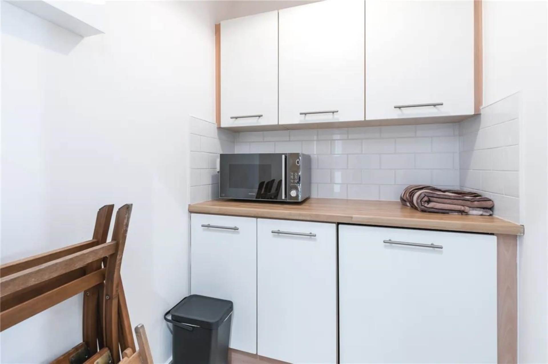 Washer/dryer. Tiled floor. Tiled splashback. Worktop. Wall mounted presses.