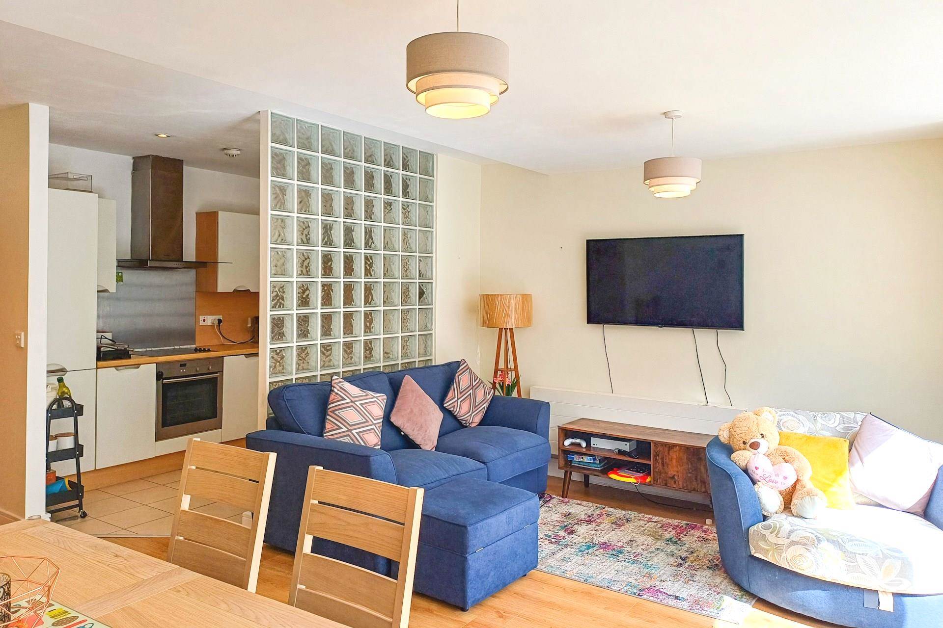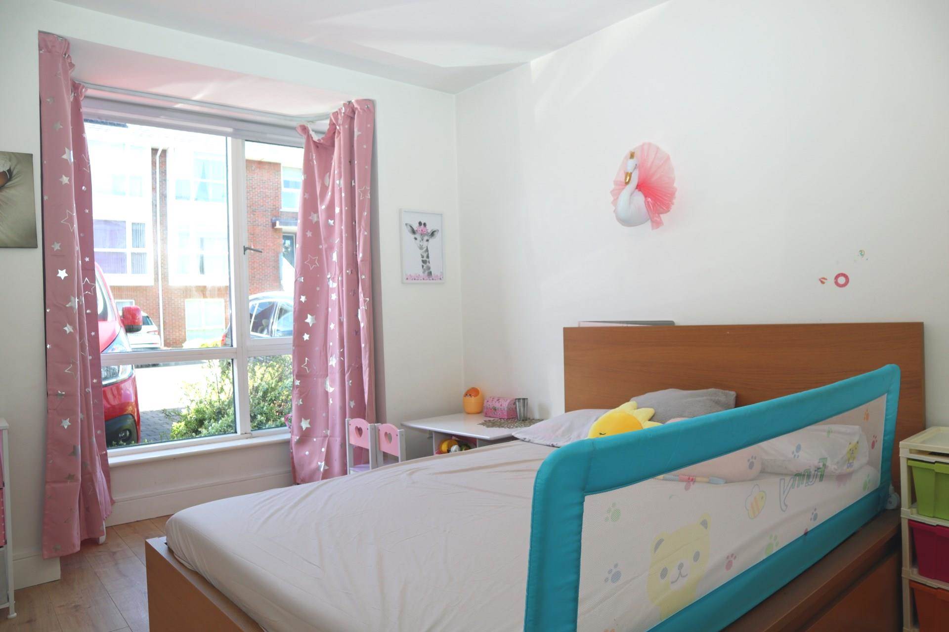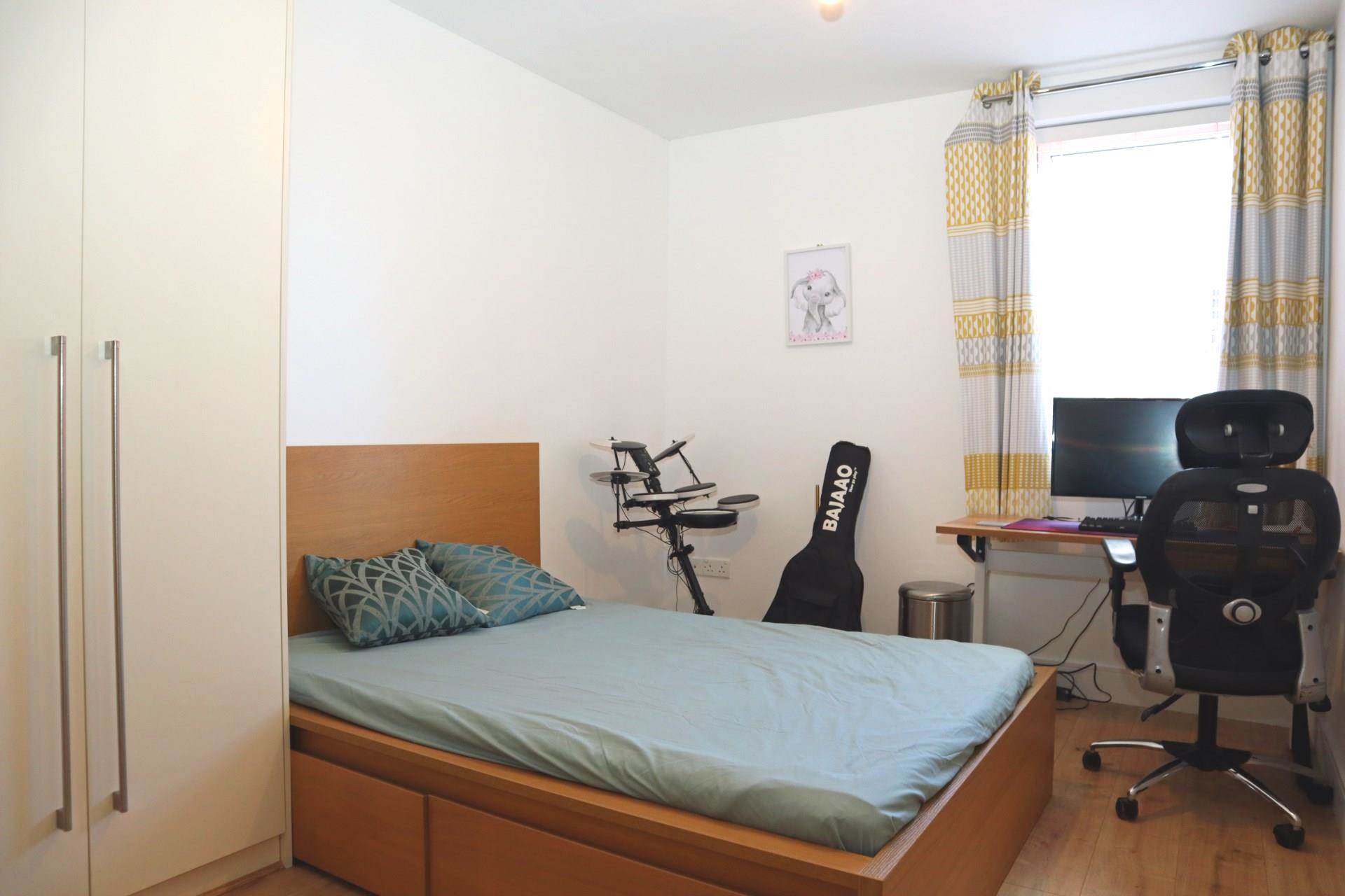 Exceptionally bright room with large full-height/ full-width window. Press containing gas boiler. High speed 1GB Virgin Media Internet connection. Wood laminate flooring.