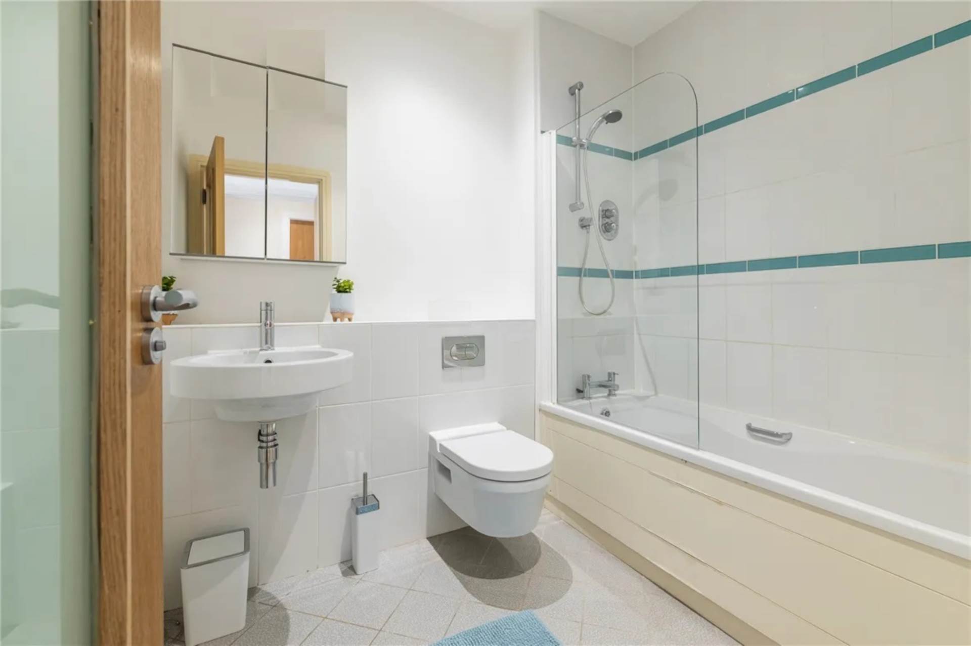 Full size bathtub with wall-mounted shower fitting and glass shower screen. WC with hidden cistern. Redestal WHB with cabinet underneath. Mirrored medicine cabinet. Heated towel rain. Tiled flooring. Part tiled walls.
