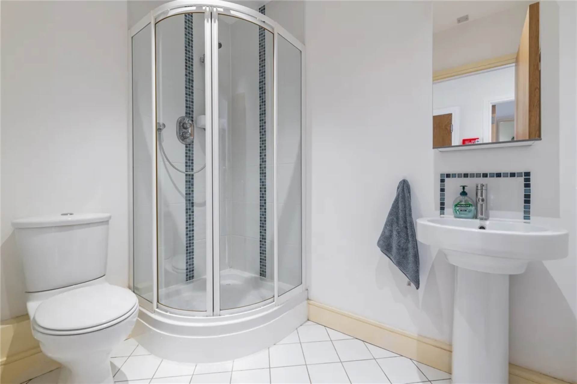 Corner shower cubicle with glass doors. WC. Pedestal WHB. Mirrored medicine cabinet. Heated towel rail. Tiled floor. Recessed lighting.